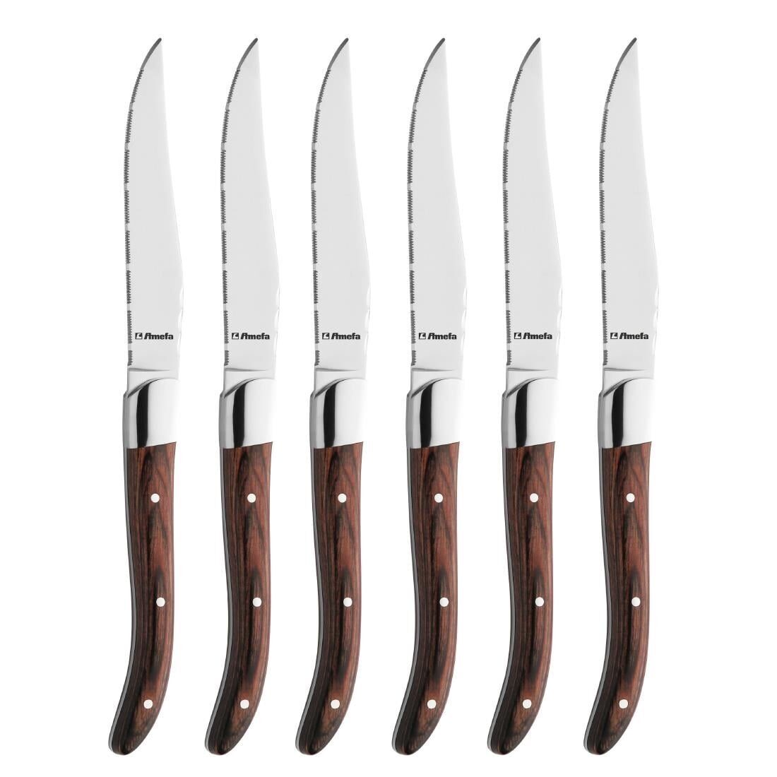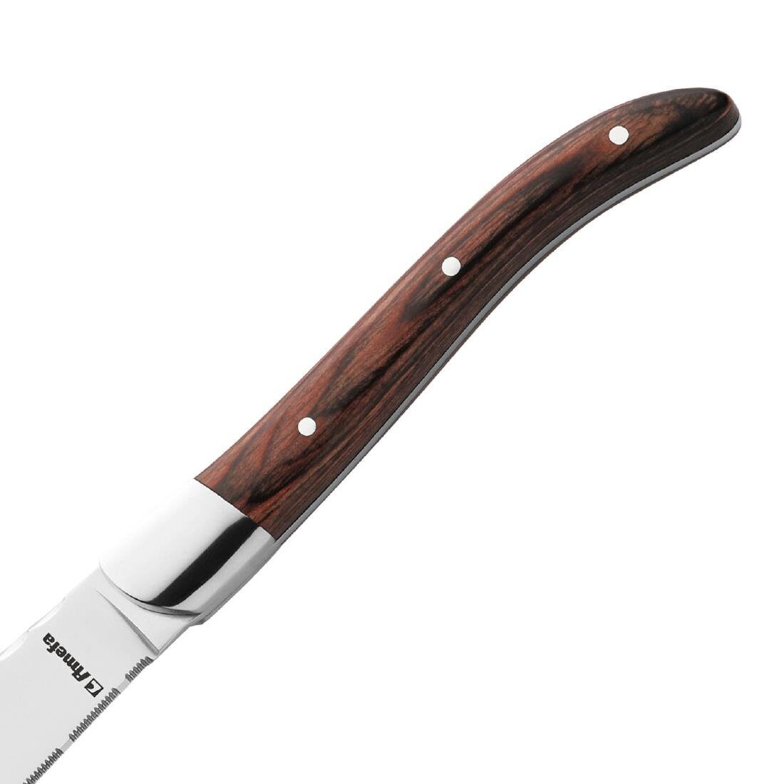 Upgrade uw steakservice met de Amefa Virgule steakmessen. Dit mes heeft een full-tang ontwerp met een geklonken grip, is extreem duurzaam en kan de hele dag door zonder tekenen van slijtage te weerstaan. Dankzij hun gekartelde messen zijn de Amefa Messen snijden moeiteloos door de biefstuk, waardoor het voor de gasten gemakkelijker wordt om van hun maaltijden te genieten.Het elegante handvat met palissandereffect voegt een vleugje verfijning toe, waardoor uw tafelsetting wordt opgefleurd. Bovendien vloeit de ergonomische handgreep samen met de natuurlijke vorm van de hand, waardoor ze comfortabel in gebruik zijn.