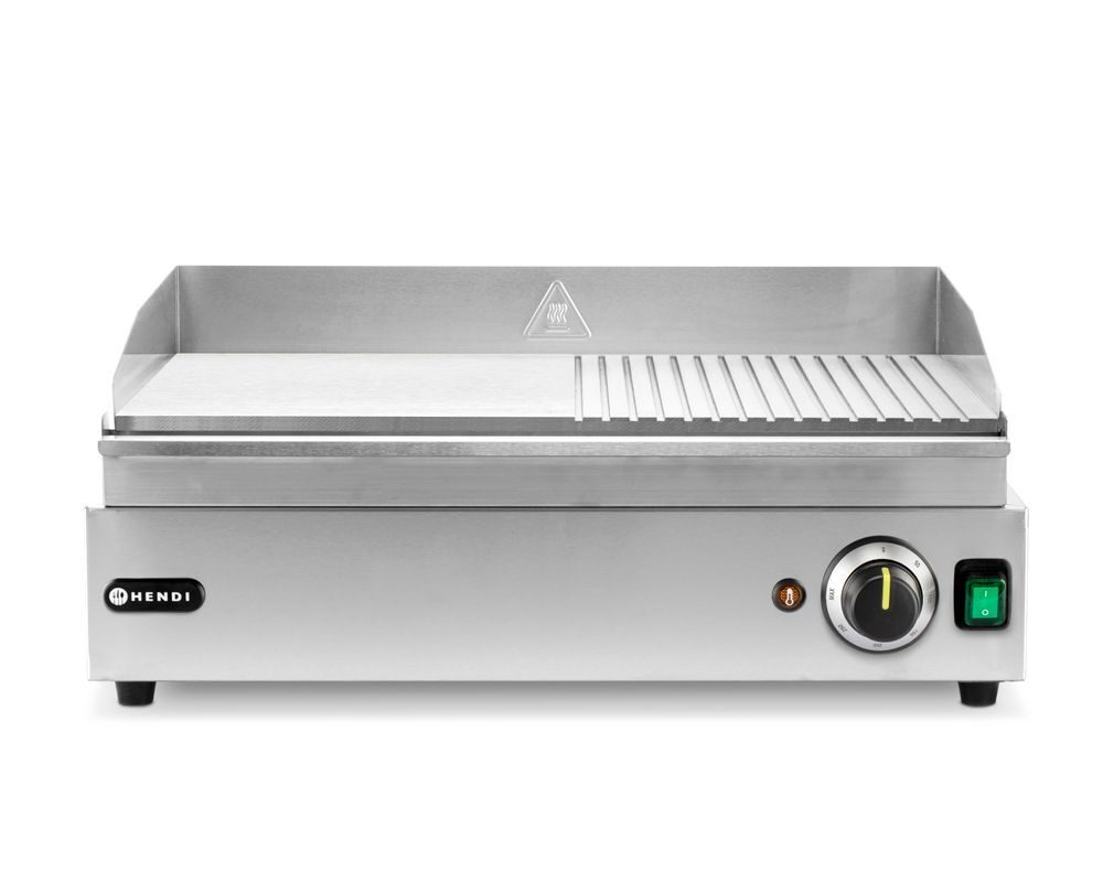 Uitgerust met antislipvoeten.De bakplaat meet 518 x 330 mm en half geribbeld en half glad.De HENDI Bakplaat half geribbeld Kitchen Line heeft een gehard stalen bakplaat dat temperaturen tot 300°C kan bereiken. Het geribbelde gedeelte is perfect voor het bereiden van vet vlees en worstjes, terwijl het gladde gedeelte perfect is voor eieren en pannenkoeken. De combinatie van de spatranden en de verwijderbare vetopvangbak bevordert de reiniging en hygiëne.