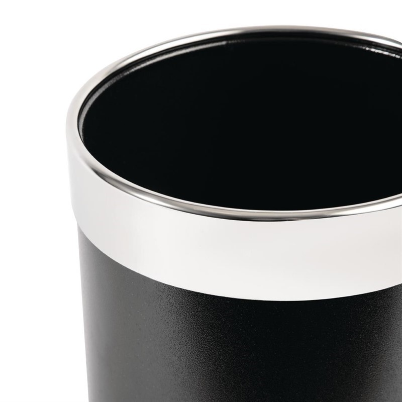 Deze stijlvolle zwarte prullenbak van Bolero met zilveren rand en lederlook is ideaal voor hotelkamers, slaapkamers en kantoren. De prullenbak heeft een gepoedercoat stalen constructie en een inhoud van 10,2 liter en is daarom zeer robuust, duurzaam en slijtvast. Perfect voor thuis en voor professioneel gebruik.