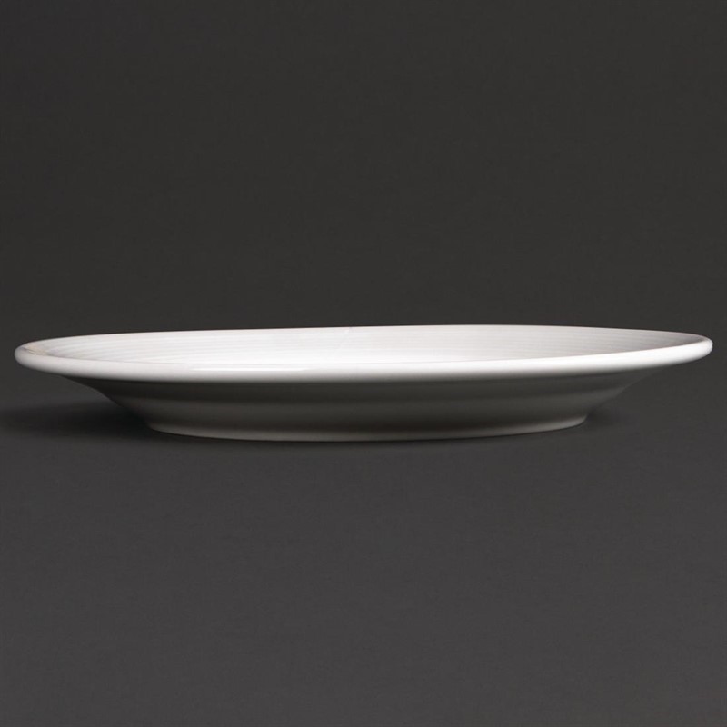 Stijlvol wit porselein met een verfijnd patroon van lijnen in reliëf. Sterke vitro kwaliteit garandeert een lange levensduur. Oven-, magnetron- en vaatwasserbestendig. Prijzen per verpakkingseenheid.