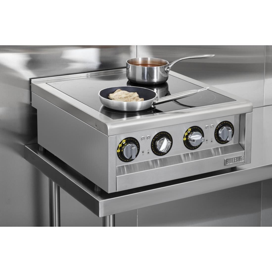 De efficiënte en effectieve inductiekookplaat met vier zones uit de Buffalo 600-serie is een fantastische oplossing voor professionele keukens die de energierekening willen verlagen zonder concessies te doen aan de betrouwbaarheid of het vermogen. De Buffalo inductiekookplaat is ontworpen voor betrouwbare dagelijkse prestaties en beschikt over vier robuuste kookzones met elk 11 vermogensniveaus, waardoor u nauwkeurig kunt koken, braden, sudderen en sauteren. De kookplaat beschikt ook over een boostfunctie, waardoor je nog meer vermogen krijgt wanneer je dat het meest nodig hebt. Misschien wel een van de meest indrukwekkende kenmerken van de inductiekookplaat uit de Buffalo 600-serie is de efficiëntie. De kookplaat uit de 600-serie is tot 70% efficiënter dan traditionele gaskookplaten en kanaliseert meer energie rechtstreeks naar het kookproces, waardoor snelle opwarmtijden worden gerealiseerd zonder vlammen of gloeiend hete elementen. Bovendien, naarmate er meer energie in het koken wordt gestoken, ontsnapt er minder warmte naar de keuken, waardoor de belasting van uw ventilatiesysteem afneemt en een comfortabelere werkomgeving ontstaat. Zodra het onderhoud voorbij is, is het apparaat moeiteloos schoon te maken, dankzij de constructie van sterk roestvrij staal en gehard keramisch glas. En als onderdeel van de Buffalo 600-serie is deze inductiekookplaat ontworpen om te combineren met andere apparaten uit de 600-serie, waardoor u een nette, naadloze kooklijn krijgt, ongeacht de grootte van uw keuken. Deze kookplaat kan worden gebruikt als aanrechtapparaat of op 600 mm brede kasten uit de 600-serie worden geplaatst (apart verkrijgbaar).