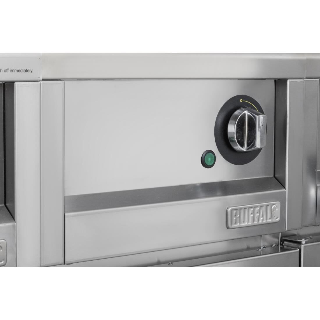 Houd uw zojuist gebakken frites of wedges perfect warm en klaar om te serveren met de Buffalo 600 Series-frituurschotel voor op het aanrecht. De frituurpan is ontworpen met het oog op betrouwbaarheid en gebruiksgemak en is het perfecte serveerstation, waarbij de inhoud gedurende langere perioden warm en smakelijk blijft. Door gebruik te maken van snel opwarmbare bovenverlichting wordt de inhoud warm en knapperig gehouden, terwijl de geperforeerde bodemplaat de kans minimaliseert dat net bereid gefrituurd voedsel in vet of vet blijft zitten. En omdat de bodemplaat een lichte helling heeft, is het gemakkelijk om bij de inhoud te komen met een geschikte schep (apart verkrijgbaar). De Buffalo 600-serie frietbak is gemaakt van sterk roestvrij staal, waardoor hij niet alleen zeer duurzaam is, maar ook gemakkelijk schoon te maken. De unit heeft ook handige verhoogde zijkanten, waardoor het voedsel binnen de gemaakte serverruimte blijft - ideaal voor het behouden van een schone, opgeruimde werkruimte. Deze frituurpan maakt deel uit van de Buffalo 600-serie en is ontworpen om te combineren met andere apparaten uit de 600-serie, waardoor u een nette, naadloze kooklijn krijgt, ongeacht de grootte van uw keuken.