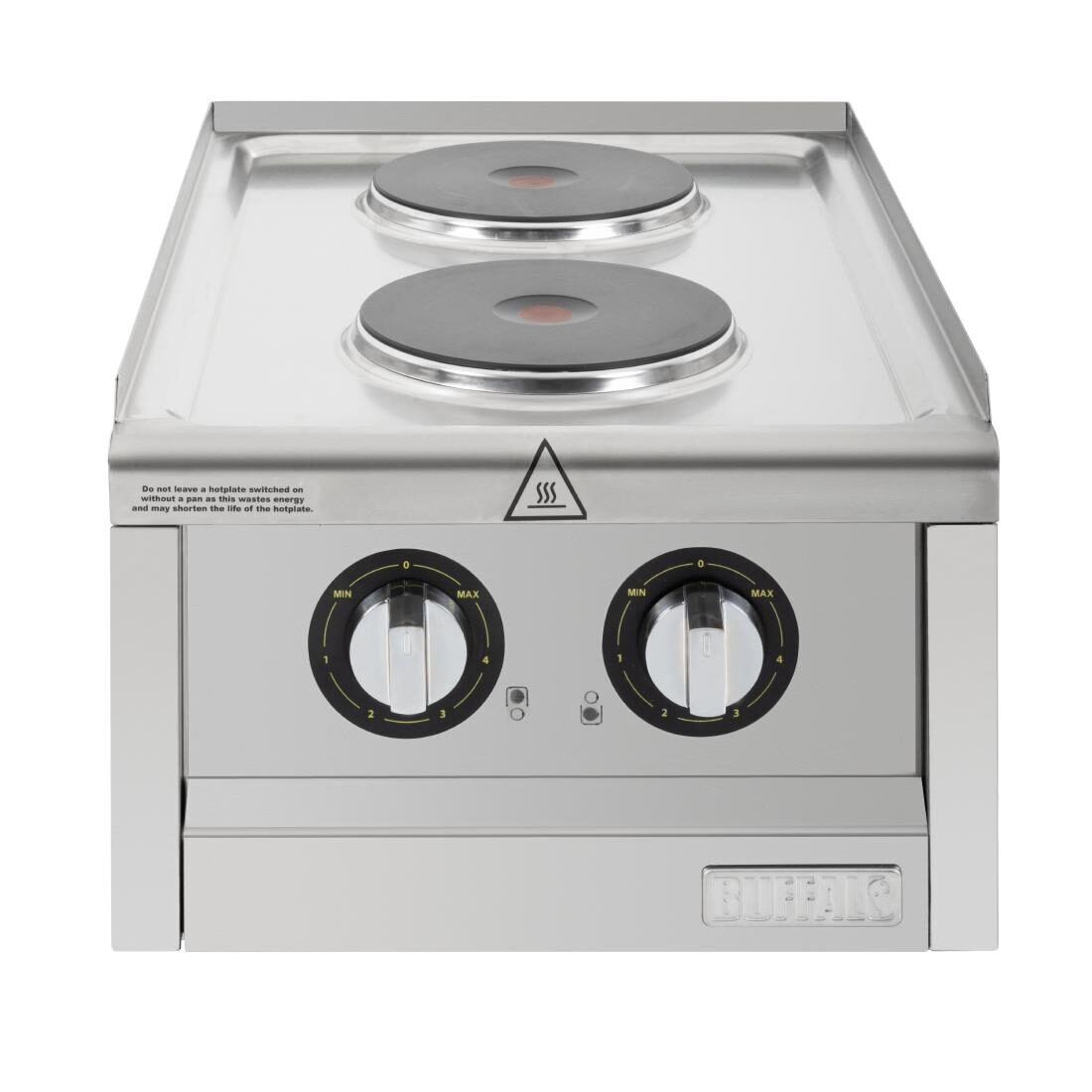 Met zijn krachtige elementen en robuust commercieel ontwerp is de elektrische kookplaat uit de Buffalo 600-serie de perfecte compacte aanvulling op de moderne professionele keuken. De kookplaat is perfect voor het braden, koken of sudderen van gerechten en geeft je de precisie die je nodig hebt om de gewenste resultaten te bereiken. De kookplaat is gebouwd met twee ringen - één van 1,5 kW en één van 2 kW en biedt veelzijdige kookposities. En omdat de kookplaat volledig is aangedrukt en afgedicht, is hij gemakkelijk schoon te houden: na gebruik eenvoudigweg schoonvegen. Deze elektrische kookplaat maakt deel uit van de Buffalo 600-serie en is ontworpen om te combineren met andere apparaten uit de 600-serie, waardoor u een nette, naadloze kooklijn krijgt, ongeacht de grootte van uw keuken. Deze kookplaat kan worden gebruikt als aanrechtapparaat of op 400 mm brede kasten uit de 600-serie worden geplaatst (apart verkrijgbaar).