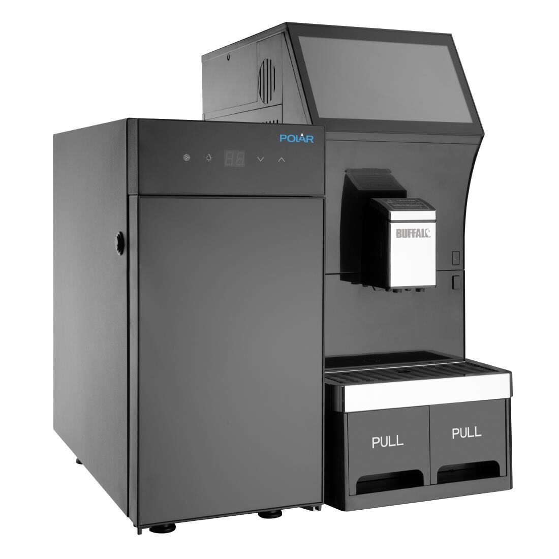 De krachtige en betrouwbare Buffalo bean to cup koffiemachine is een uitstekende oplossing voor het snel leveren van heerlijke, aromatische koffie met een druk op de knop. Volledig automatisch, de koffiemachine houdt uw keuze van bonen in zijn 1kg capaciteit hoppers en gebruikt een ingebouwde verstelbare molen om de vers smakende dranken naar uw specificaties te creëren.Het bedienen kon echt niet eenvoudiger - het 10" touchscreen display zorgt ervoor dat de machine geschikt is voor zowel zelfbediening als assistentiegebieden, zoals ontbijtbuffetten of personeelskamers. De Buffalo bean to cup koffiemachine geeft je ook veel drankopties - van schuimige cappuccino's tot intense espresso, alles is beschikbaar vanaf het intuïtieve touchscreen display. Het speciale design van de melkopschuimer geeft melk en water tegelijk af, waardoor de service tijden verder verkorten.De grote capaciteit van de 3,5L water tank, gecombineerd met de aanzienlijke koffiebonen hopper en afvalbakken, betekenen minder routinematige hervullingen en ledigingen gedurende de dag, en het handige alarm voor de koffiedikbak zorgt ervoor dat je precies weet wanneer het geleegd moet worden. De machine kan ook aangesloten worden op gebarrelleerd of gebotteld water als dat nodig is (niet op het hoofdwaternet).