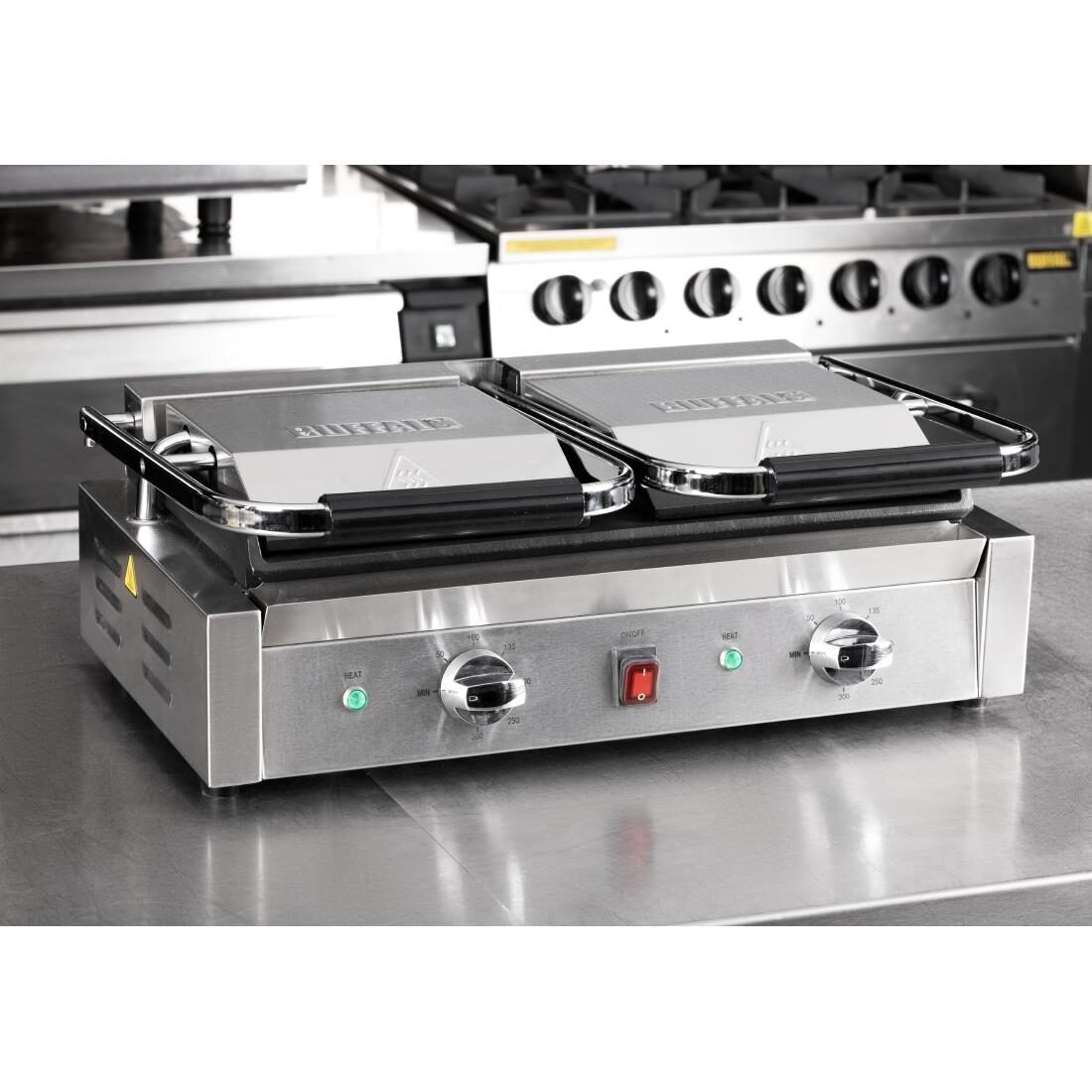 Met de professionele dubbele contactgrill van Buffalo hebt u de volledige controle over uw grillgerechten. De grill beschikt over onafhankelijk instelbare grillplaten, zodat u twee verschillende gerechten op verschillende temperaturen gelijktijdig kunt bereiden. En omdat de platen vlak zijn, is de bereiding snel en consistent - kipfilet, vis, steaks of panini worden snel bruin.Voor nog meer consistentie bij het koken zijn de zwaar uitgevoerde bovenplaten tegen elkaar uitgebalanceerd en zo gemonteerd dat het contact tussen de plaat en het voedsel optimaal is. Dit helpt het kookproces te versnellen, terwijl de ingebouwde lekbak ook de hoeveelheid vet vermindert, voor een gezonder en smakelijker resultaat.