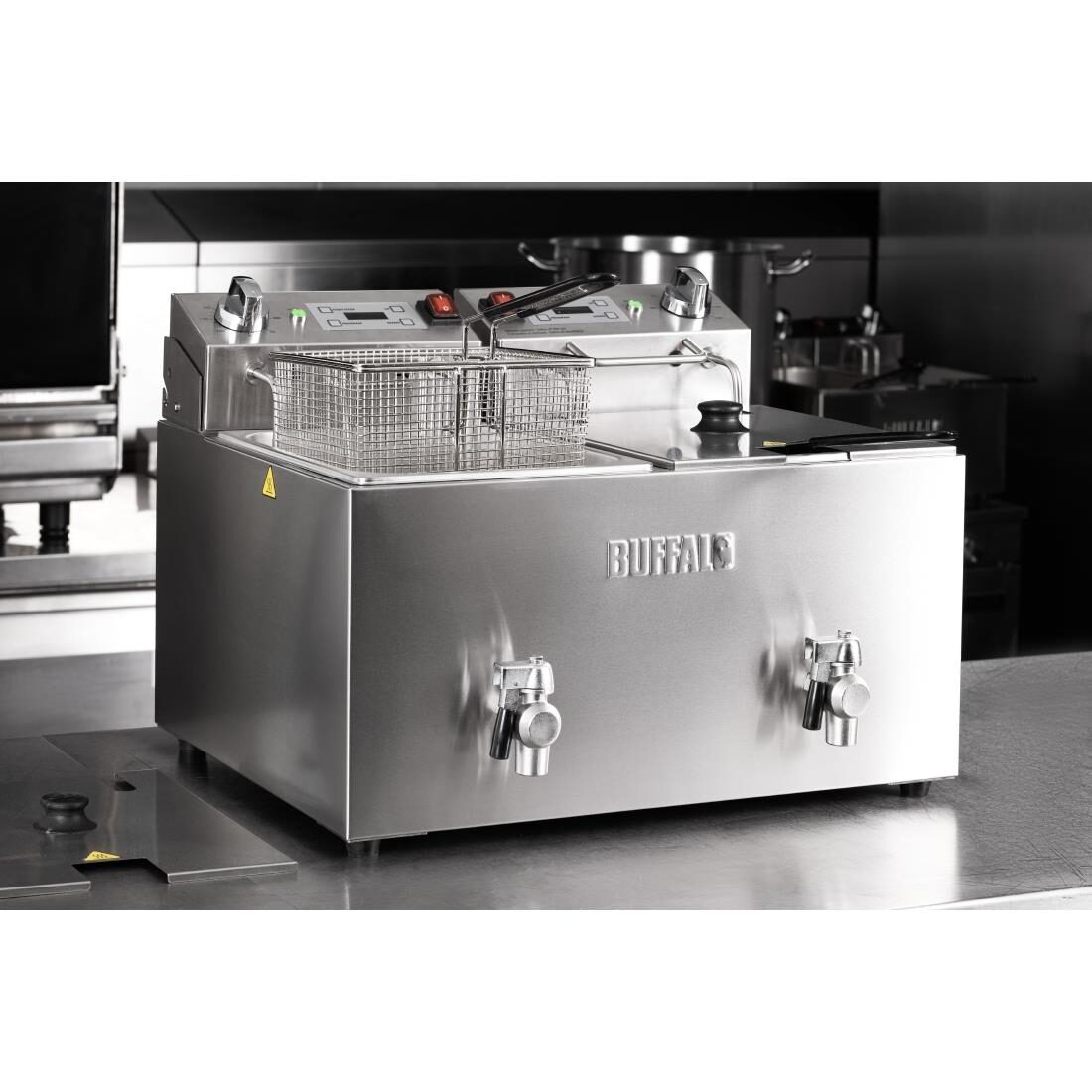 Bereid al je gefrituurde favorieten met de 8Ltr Buffalo dubbeltank aanrecht friteuse. Ontworpen voor dagelijkse prestaties en betrouwbaarheid, maakt de friteuse het eenvoudig om de resultaten te bereiken die je zoekt - of dat nu traditionele friet, zeevruchten of desserts zijn.De Buffalo friteuse is uitgerust met twee krachtige onafhankelijke 2.9kW elementen, die je de flexibiliteit geven om grote volumes te koken terwijl je ook de temperatuur snel kunt herstellen wanneer je met bevroren voedsel vult. De temperatuur wordt geregeld via de eenvoudige boven gemonteerde draaithermostaten, en dankzij de meegeleverde digitale timers en alarmen kun je consistent koken elke keer. En aangezien elke tank onafhankelijk wordt bestuurd, heb je de flexibiliteit om op twee verschillende temperaturen op één station te koken. Alternatief, tijdens rustigere uren, kan één zijde worden uitgeschakeld om energie te besparen.Wanneer je klaar bent voor de dag, is de hele friteuse eenvoudig schoon te maken en te onderhouden. De voor gemonteerde aftapkranen maken het proces nog eenvoudiger - er is geen behoefte om zware oliepan te tillen - zet gewoon een container eronder en open een kraan. De V-vormige pannen optimaliseren het olie-afvoerproces, waardoor de tank klaar is om te worden schoongemaakt en bijgevuld. En wanneer de friteuse niet in gebruik is, helpen de meegeleverde roestvrijstalen deksels om de olie te beschermen tot de volgende kookbeurt.Let op: elke tank heeft een aparte stroomkabel.