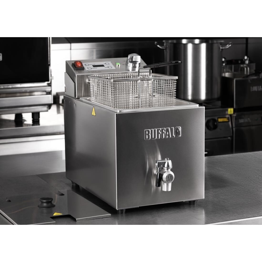 Kook al je gefrituurde favorieten met de 8Ltr Buffalo tafelmodel friteuse. Ontworpen voor dagelijkse prestaties en betrouwbaarheid, maakt de friteuse het gemakkelijk om de resultaten te krijgen die je zoekt - of dat nu traditionele friet, zeevruchten of desserts zijn.De Buffalo friteuse is uitgerust met een krachtige 2.9kW element, waardoor je de flexibiliteit hebt om grote hoeveelheden te koken en tegelijkertijd de temperatuur snel te herstellen wanneer gevuld met bevroren voedsel. De temperatuur wordt geregeld via de eenvoudige boven gemonteerde draaithermostaat, en dankzij de meegeleverde digitale timer en alarm kun je elke keer een consistente bereiding garanderen.Als je klaar bent voor de dag, is de hele friteuse eenvoudig schoon te maken en te onderhouden. De aan de voorkant gemonteerde aftapkraan maakt het proces nog eenvoudiger - er is geen noodzaak om zware pannen met olie op te tillen - plaats simpelweg een container eronder en open de kraan. De V-vormige pan maximaliseert de afgevoerde olie, zodat deze klaar is voor reiniging en navulling. En wanneer de friteuse niet in gebruik is, helpt het meegeleverde roestvrijstalen deksel de olie te beschermen tot de volgende bereiding.