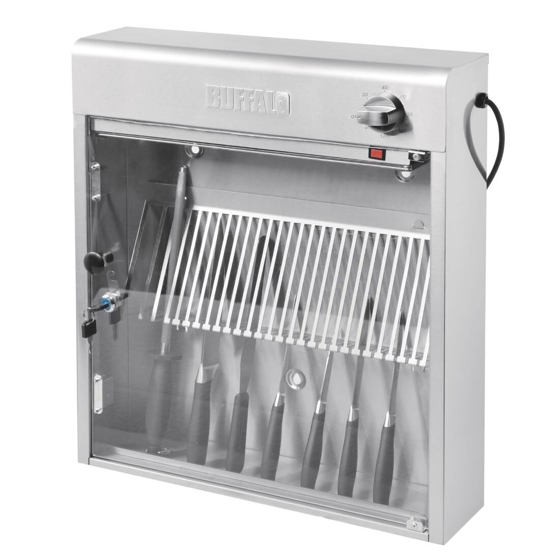 RVS messenkast om kruisbesmetting te voorkomen, steriliseert door middel van UV licht. Kenmerken: instelbare tijdklok en transparante deur. Wandmontage.