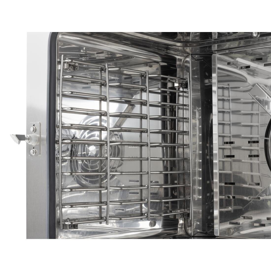 Voor meer informatie over dit product of voor het boeken van een live productdemonstratie, bel alstublieft (+44) 0117 345 9539.Betrouwbare, gebruiksvriendelijke combi-ovens zijn vaak een van de meest kritieke kookapparaten in de professionele keuken. Ze moeten over alle functionaliteit beschikken die je nodig hebt, terwijl ze gemakkelijk schoon te maken zijn, eenvoudig in gebruik en idealiter voor een goede prijs.Dat is precies wat de Buffalo touchscreen compacte combi-oven is - een uitstekend veelzijdige, fantastische waarde alles-in-één kookoplossing met de flexibiliteit om je te helpen de kookresultaten te bereiken die je zoekt.Met zijn royale capaciteit van 6x 1/1 gastronorm bakken biedt de Buffalo combi-oven een indrukwekkende hoeveelheid ruimte voor zijn compacte formaat. Gemakkelijk verstelbare schappen en gastronorm-compatibiliteit zorgen ervoor dat je snel schalen tussen stations kunt overbrengen om tijd te besparen.De combi-oven maakt dagelijkse bediening ook moeiteloos. Het aan de voorzijde gemonteerde 5" full-screen touchscreen geeft je de mogelijkheid om meerfasige kookprogramma's in te stellen en te draaien, zodat verschillende gerechten allemaal tegelijkertijd klaar zijn. Er kunnen tot 99 programma's met elk tot 6 fases worden ingesteld, of kies uit een van de 40 voorgeprogrammeerde klassieke opties zoals bacon, croissants, rosbief of chocoladebrownies - alle services zijn gedekt.Dat is niet alles - de oven bevat geavanceerde ClimaControl technologie, een zeer nauwkeurig systeem waarmee je precies kunt instellen hoeveel warmte en stoom voor elk programma wordt gebruikt. Je kunt ook koken met behulp van een keuze aan tijd, kernsonde of "Delta T" functies - deze indrukwekkende flexibiliteit is klaar voor je creativiteit.Als je klaar bent, is het schoonmaken ook vereenvoudigd. Stel eenvoudig de automatische eenknops wasmodus in en de Buffalo combi-oven is brandschoon, klaar voor volgende gebruik.Let op: deze optie bevat een sterke standaard