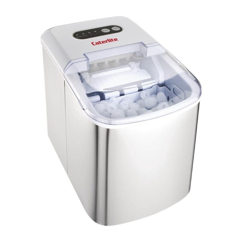 Compacte en handige ijsblokjesmachine van Caterlite. Deze ijsblokjesmachine dient handmatig gevuld te worden en is ideaal voor personeelsruimtes, wachtruimtes, kleine restaurants en zelfs in huis. Hij is zeer eenvoudig in gebruik; vul eenvoudigweg het reservoir met water en het apparaat produceert kleine of grote kogelvormige ijsklontjes. Komt met handige schep om het ijs uit te kunnen scheppen of u leegt de mand in één keer.
