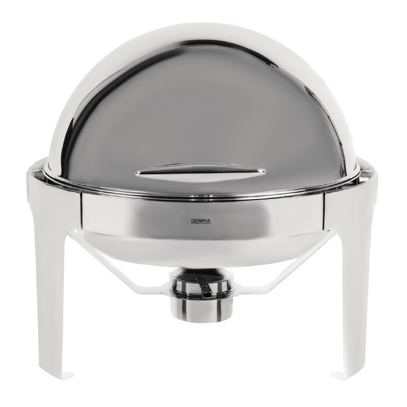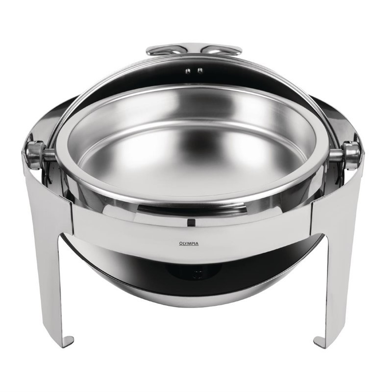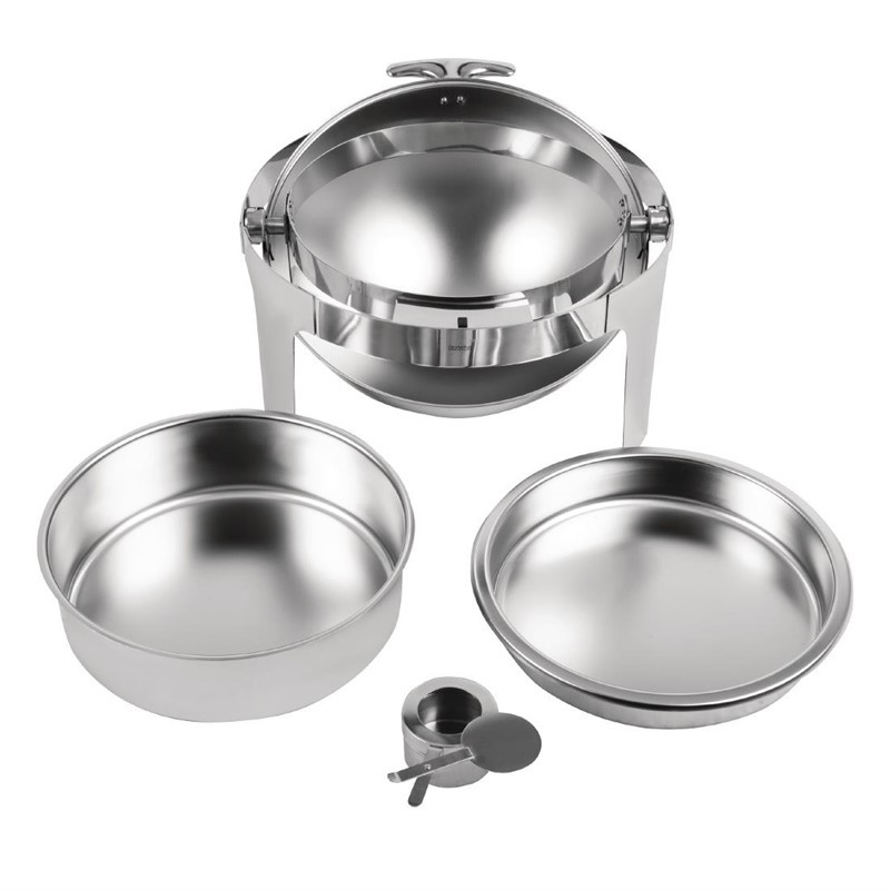 Hoogglans 18/8 RVS ronde chafing dish met rolltop deksel. Poten gevormd uit RVS plaat. Compleet met waterpan, voedselpan, deksel en brandpastahouder. Inhoud 6L. Afmeting 53x50x35cm.
