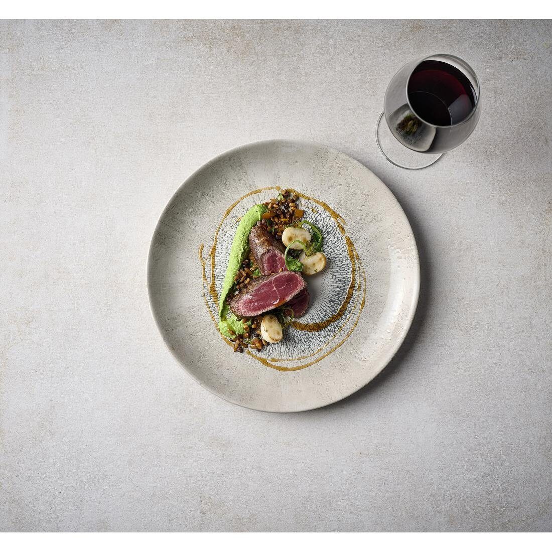 Studio Prints Fusion toont een textuureffect aan de rand, geïnspireerd door de fusie van meerlaagse reactieve glazuren. Radiaal en expressief, dit ontwerp combineert kleur en textuur met een eigentijds wit centrum, ideaal om hoogwaardige voedselpresentatie te omkaderen.