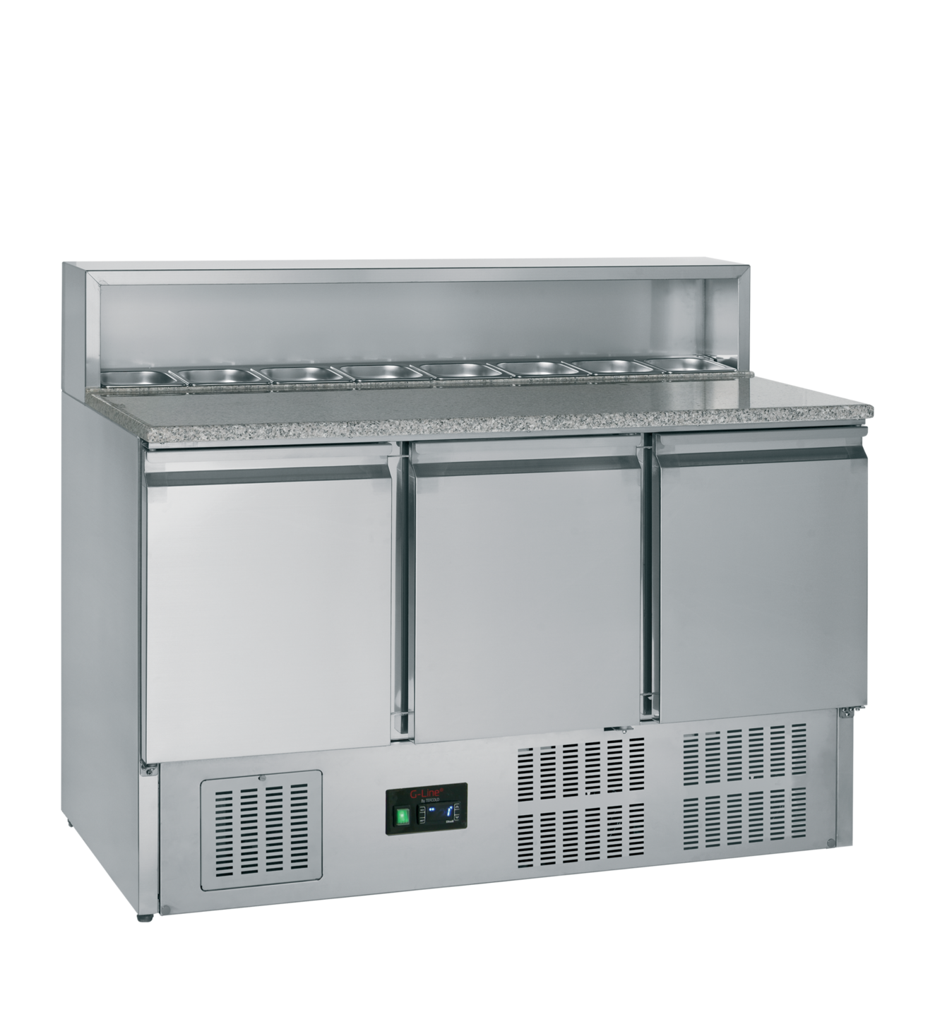 Voordelige G-line pizzacounter met granieten werkblad. Ideaal voor het maken van pizza's, omdat het granieten werkblad koel blijft en het deeg minder snel aan het werkblad blijft plakken. De counter is geschikt voor 8x GN-bakken in maat 1/6 en de kasten hebben GN1/1-afmetingen.