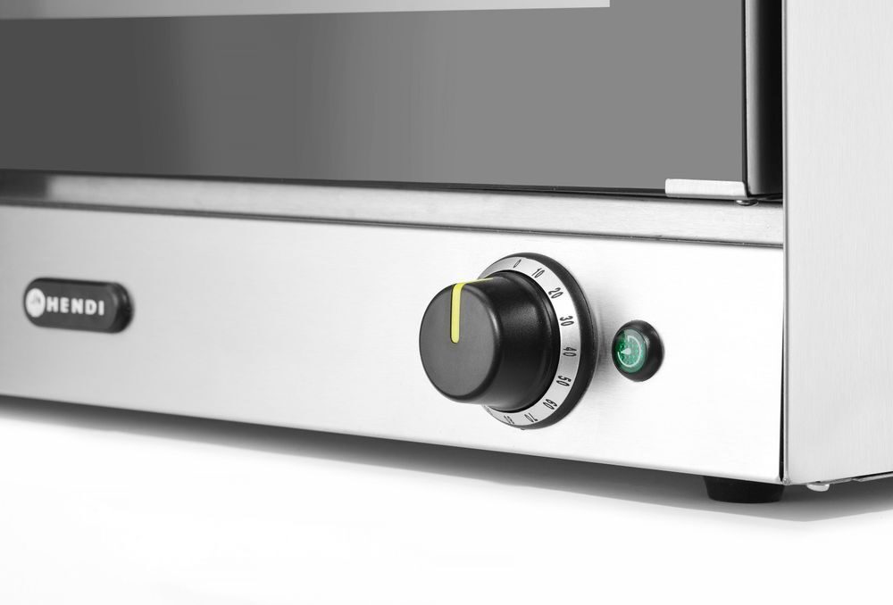Geleverd met GN 1/1 pan van 65 mm en GN 1/1 rooster.De HENDI convectieoven H100 is een robuuste roestvast stalen convectieoven met directe bevochtiging, dubbele ventilatoren en verwarmingselementen voor consistente prestaties. De oven is voorzien van een cool-touch, dubbelglas deur en binnenverlichting, en biedt plaats aan 4x GN 1/1-trays met een tussenruimte van 75 mm. Een waterinlaat aan de achterzijde en een timer van 120 minuten zorgen voor een soepele werking in veeleisende keukens.