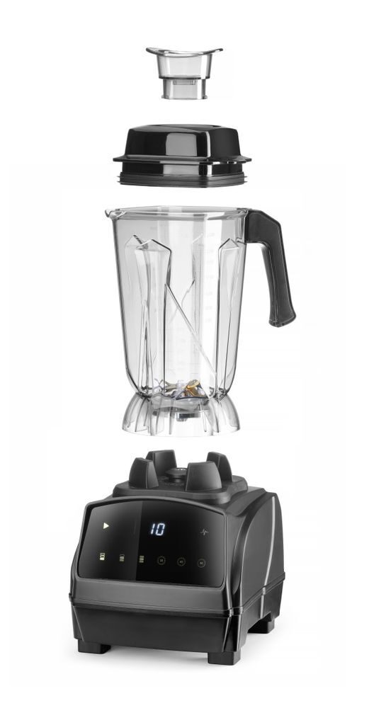 Inclusief stamper van polypropyleen.De HENDI Digital bar blender BPA-vrij is een krachtige blender, professioneel uitgevoerde blender met een duurzame 2,5L Tritan mengkan, roestvast stalen mesjes met titaniumcoating en een digitaal touchscreen met 3 snelheden en tijdinstellingen. De veiligheid wordt gewaarborgd door een vergrendelsysteem en bescherming tegen oververhitting, wat het een betrouwbare keuze maakt voor commercieel gebruik.