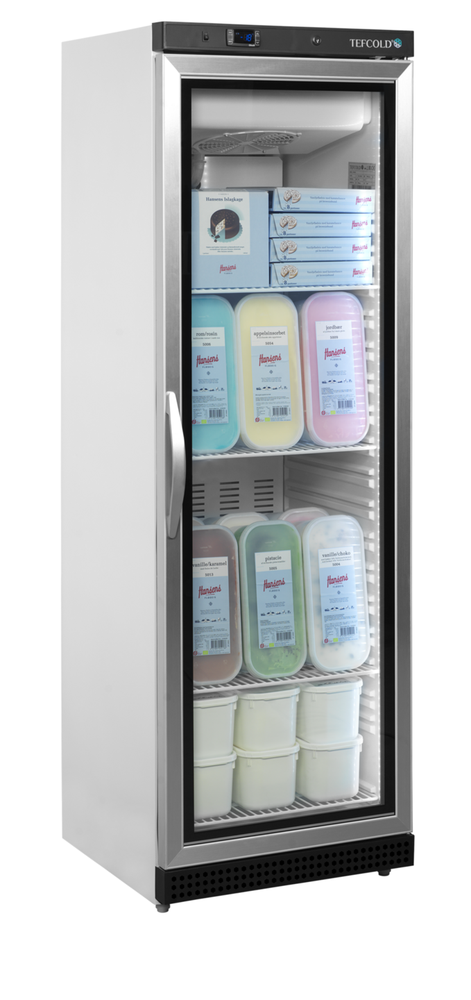 De UF-VG-serie displayvriezers is de geventileerde versie van onze witte vriezers met glazen deur. Hij is verkrijgbaar in verschillende maten. Het geventileerd koelsysteem zorgt voor een gelijkmatige temperatuur in de hele kast. De temperatuur kan worden ingesteld op een gebruiksvriendelijk digitaal thermostaatdisplay.