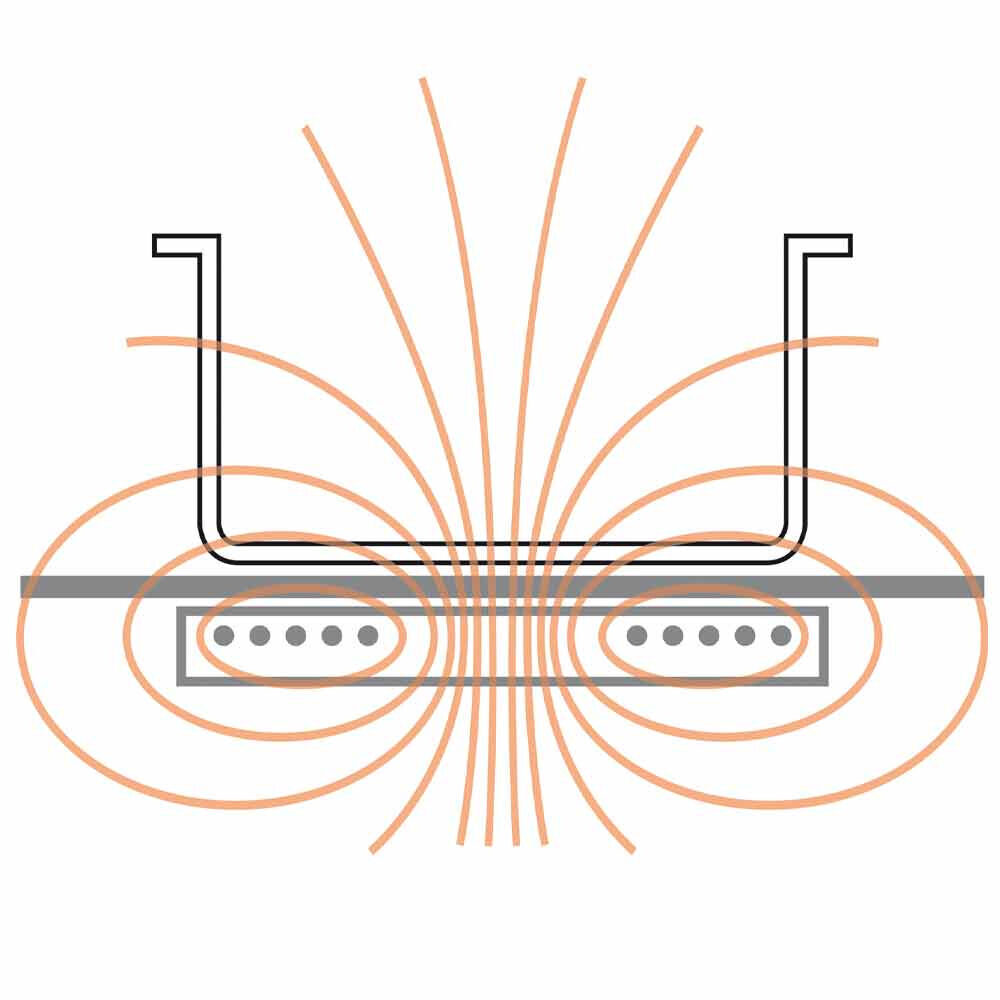 De warmte wordt geproduceerd door een magnetisch veld rechtstreeks in de container. Dit veld wordt elektronisch gecreëerd en er is geen verwarmingselement, waardoor het extreem veilig is. Koken gebeurt vrijwel zonder warmteverlies; dit is de meest economische technologie, omdat het verwijderen van de recipiënt voldoende is om het koken te stoppen. Er worden achtereenvolgens drie natuurkundige fenomenen in werking gesteld: