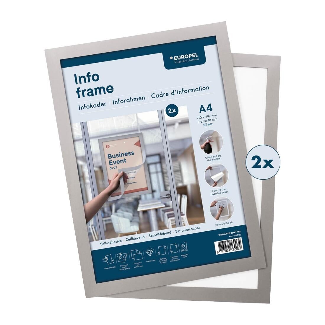 Verhoog je presentatie met de Zelfklevende Info Frame Set, ontworpen voor een duidelijke en professionele weergave. Ideaal voor verschillende omgevingen, deze set bevat twee A4-kaders die veelzijdigheid en gebruiksgemak bieden. Perfect voor kantoren, winkels of openbare ruimtes, biedt de Zelfklevende Info Frame Set een stijlvolle en efficiënte oplossing voor het weergeven van belangrijke informatie. Geschikt voor papierformaat A4 (297x210mm) met zichtbaar gebied van 289x202mm en externe afmetingen van 325x238mm. De breedte van het frame is 18mm. Kan zowel in portret- als landschapsoriëntatie worden gebruikt, afhankelijk van je weergavebehoeften. Wanneer aangebracht op glas, biedt het frame een dubbelzijdige weergave met de framekleur zichtbaar aan beide zijden.