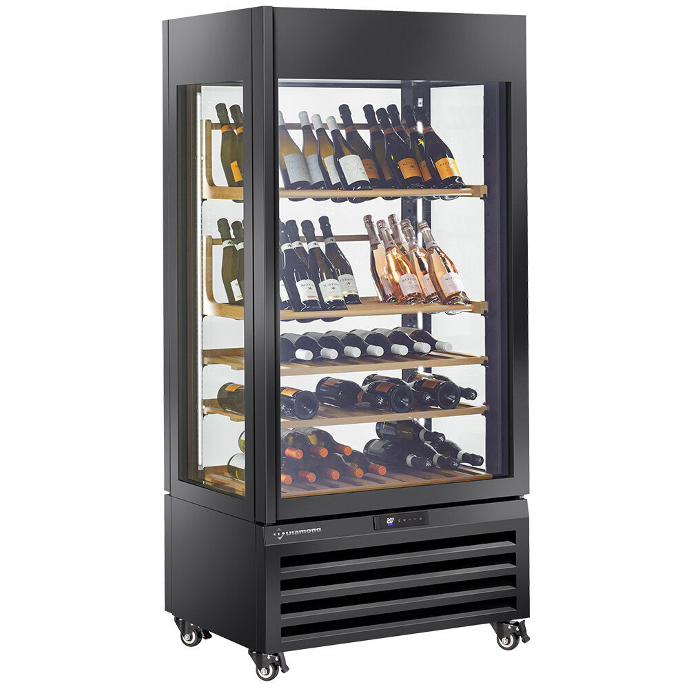 Met hun strakke design zullen de Exalta EVO vitrines uw verschillende wijnen in de kijker zetten. Groot glazen displayoppervlak (EURONORM 400x600 en GASTRONORM 1/1), 4 glazen zijkanten, volledig glazen “FULL GLASS” deur, LED-verlichting op elke staander. Dit zijn slechts enkele van de kenmerken die van deze vitrines de ideale metgezellen maken voor veeleisende wijnliefhebbers. Verkrijgbaar in twee versies, roestvrij stalen onderstel (zie ref: ...-VB en ...-VW) of horizontaal en schuine houten onderstel (zie ref: ...-VB2 en ...-VW2).