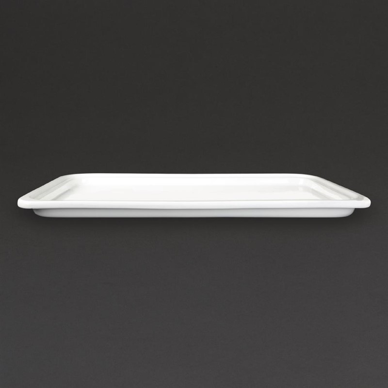 Wit porseleinen GN 1/1 schaal van Olympia, 30 mm diep. Geschikt voor de bereiding, presentatie en opslag van warme of koude gerechten. Kan tevens gebruikt worden als praktisch en stijlvol alternatief voor traditionele RVS pannen.