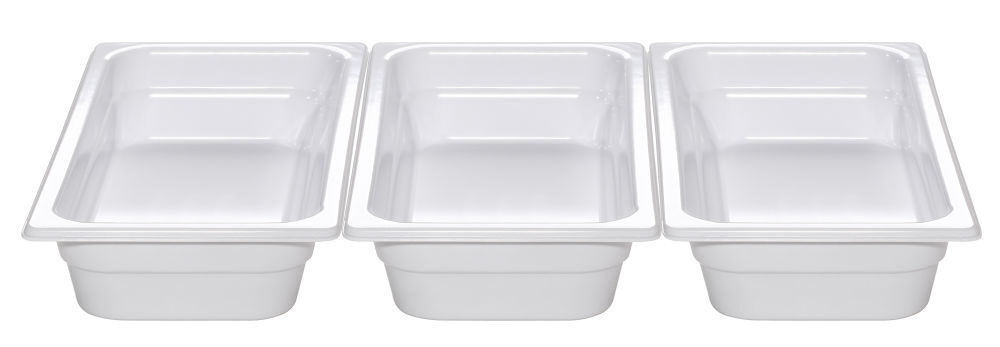 Melamine is hygiënisch en stootvast. Alleen voor presenteren. Niet geschikt voor gebruik in chafing dishes.