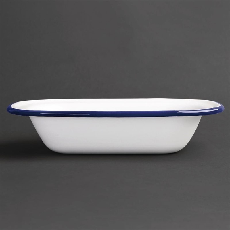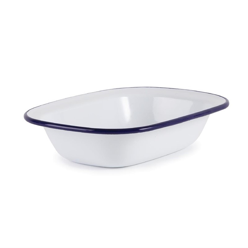Deze collectie wit en blauw emaille servies is een ware blikvanger voor op tafel. Deze schalen zijn gemaakt van hoogwaardige kwaliteit RVS waarop een zeer duurzame laag gesmolten glas is aangebracht, waardoor een glad oppervlak verkregen wordt. Hoe meer u de schalen gebruikt, hoe meer karakter ze krijgen. Het emaille maakt de schalen bestand tegen hitte en chemische stoffen zodat ze geschikt zijn voor in de vaatwasser en de oven.