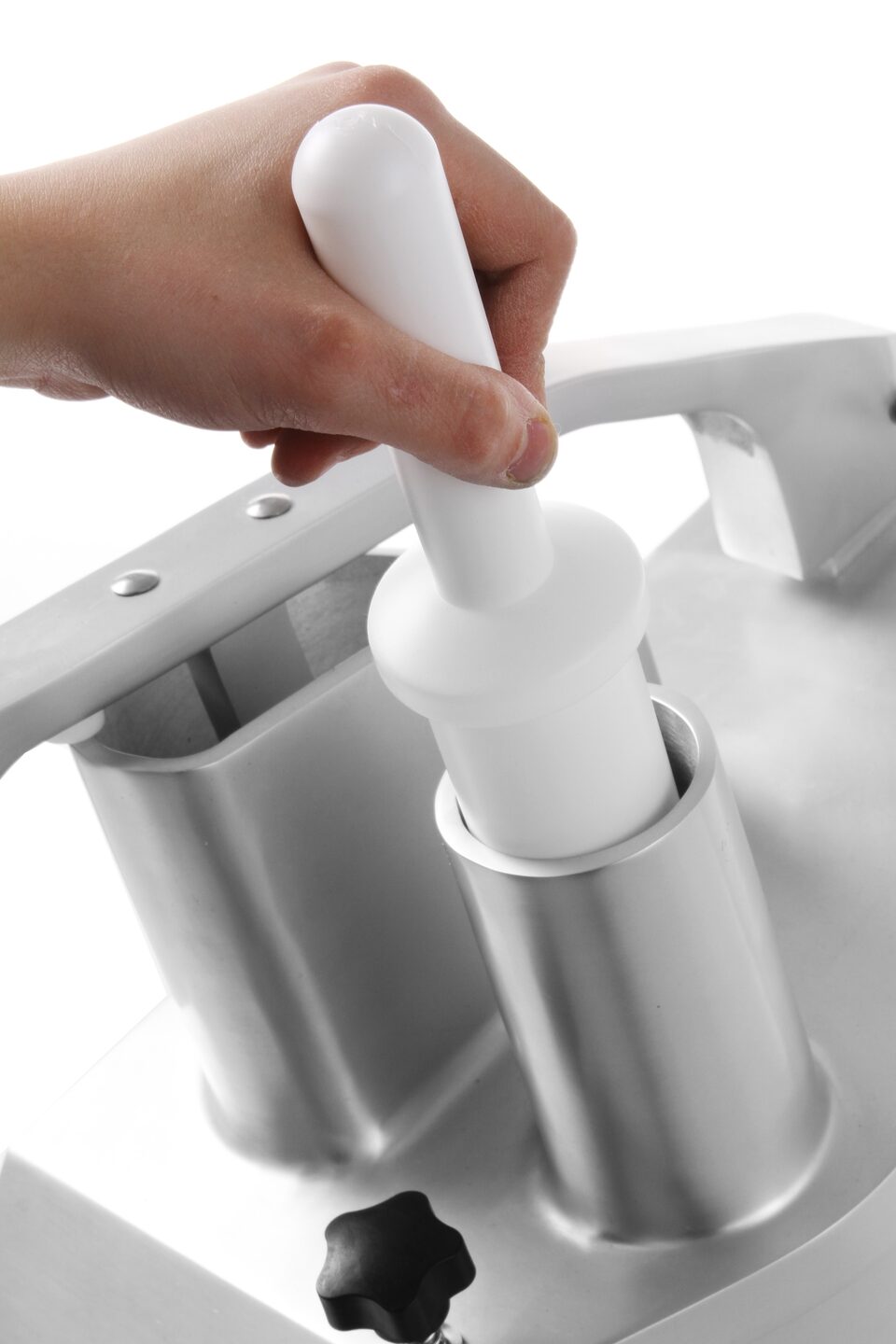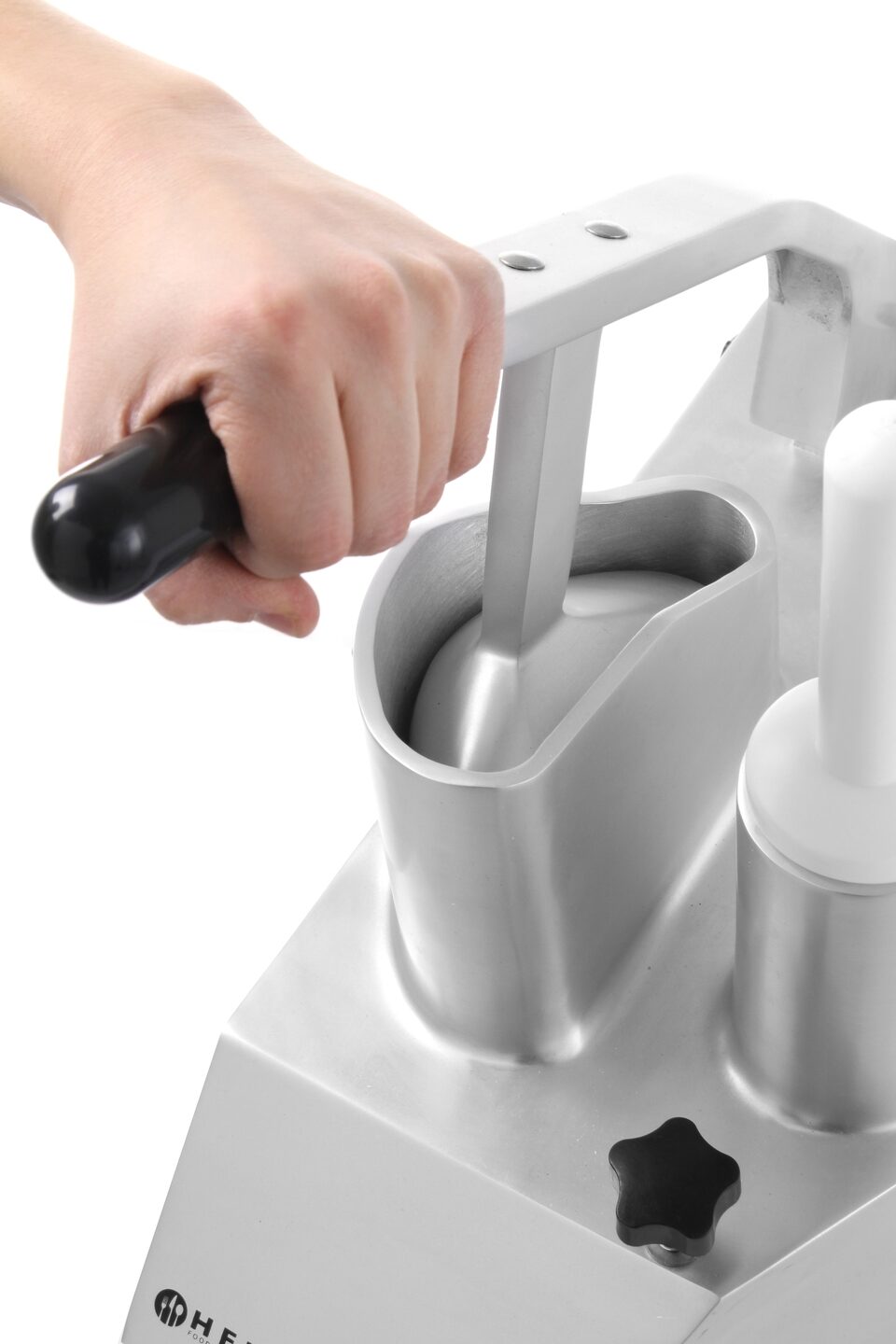 De machine is ontworpen voor intensief gebruik in de professionele horeca. Met de grote opening met hendel verwerkt u moeiteloos hele kolen of aardappelen, terwijl de kleine opening perfect is voor het gecontroleerd invoeren van langwerpige groenten zoals wortels of komkommers. Dit maakt de machine een onmisbare partner voor zowel mise-en-place als directe bereidingen.