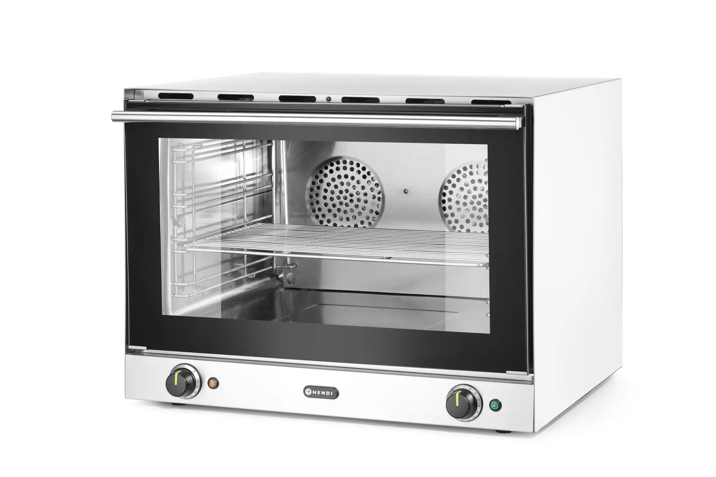 Geleverd met GN 1/1 pan van 65 mm en GN 1/1 rooster.De HENDI convectieoven H100 is een robuuste roestvast stalen convectieoven met directe bevochtiging, dubbele ventilatoren en verwarmingselementen voor consistente prestaties. De oven is voorzien van een cool-touch, dubbelglas deur en binnenverlichting, en biedt plaats aan 4x GN 1/1-trays met een tussenruimte van 75 mm. Een timer van 120 minuten zorgen voor een soepele werking in veeleisende keukens.