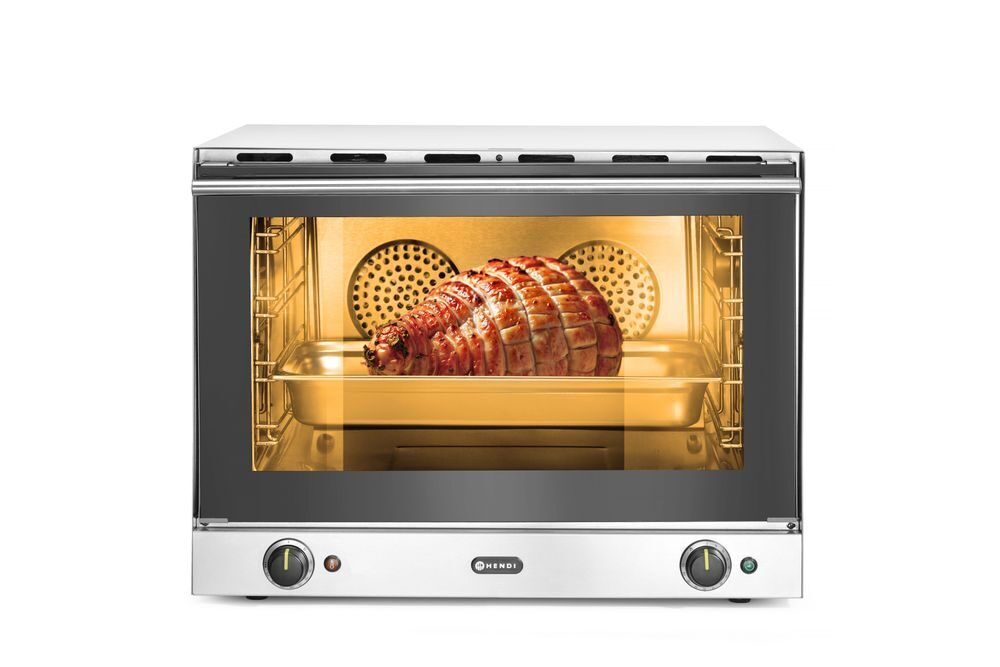 Geleverd met GN 1/1 tray van 65 mm diep en GN 1/1 rooster.De HENDI Heteluchtoven met bevochtiging H100S is een robuuste roestvast stalen heteluchtoven met directe bevochtiging, dubbele ventilatoren en verwarmingselementen voor consistente prestaties. De oven is voorzien van een cool-touch deur met dubbel glas en binnenverlichting en biedt plaats aan 4x GN 1/1 trays met een afstand van 75 mm. Een watertoevoer aan de achterzijde en een timer van 120 minuten zorgen voor een soepele werking in drukke keukens.