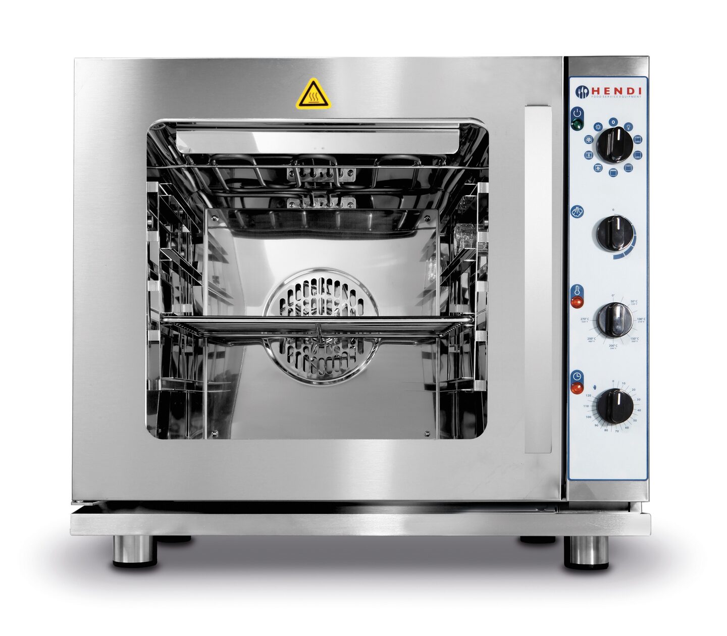Hoogwaardige roestvast stalen behuizing en ovenkamer. Handbediend bedieningspaneel met knoppen voor functie, temperatuur, tijd en hoeveelheid stoom. Heeft functies voor ontdooien, voorverwarmen, hetelucht, grill, stoom of een combinatie van deze functies. De temperatuur kan worden ingesteld tot 280˚C. De timer kan worden ingesteld op 120 minuten. Hetelucht door middel van twee verwarmingselementen en een ventilator. Met topgrillelementen. In de oven passen 4x GN 2/3-trays, de afstand tussen de trays is 70 mm. Geleverd met 1x GN 2/3 grid. Hetelucht 3 kW, grill: 1,8 kW. Ovenkamer verwarming: bodem 1.6 kW, top 0.7 kW. Verstelbare poten van 55 tot 75 mm. Roestvast staal.