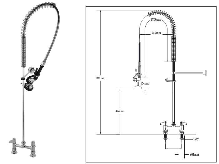 - Voorspoeldouche met tweepuntsbladmontage (153mm) met 1/2" aansluiting