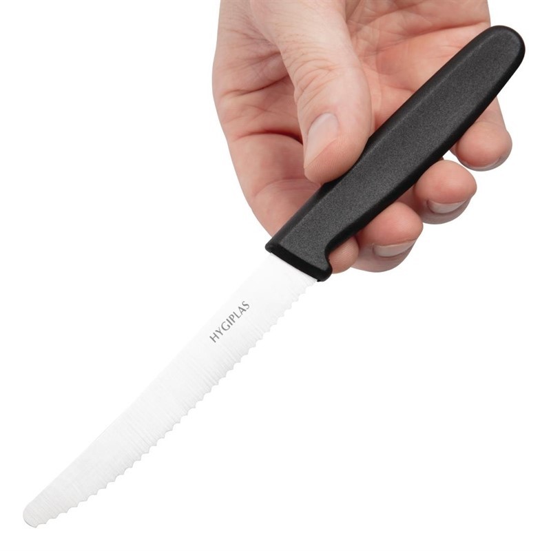 Dit hoge kwaliteit gekartelde tomatenmes van Hygiplas is vaatwasmachinebestendig en eenvoudig te slijpen. Met zwart nylon heft voor een comfortabele grip en ideaal voor het snijden tomaten zonder ze te kapot te drukken.