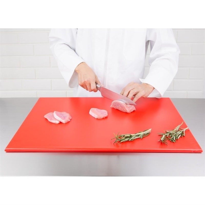 Voorkom kruisbesmetting in uw keuken met deze rode snijplank van Hygiplas. De plank is zeer handig wanneer u gebruik maakt van een kleurensysteem waarbij elke kleur snijplank voor een bepaald type product gebruikt wordt om de verspreiding van schadelijke bacteriën tegen te gaan. Zo is deze snijplank te gebruiken voor rauw vlees. De snijplank is niet-absorberend, reukloos, niet-toxisch en voldoet aan alle hygiënevoorschriften. Ook is de plank zeer robuust en duurzaam en bestand tegen veelvuldig gebruik in een drukke, professionele keuken.