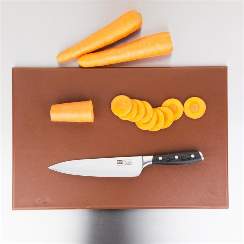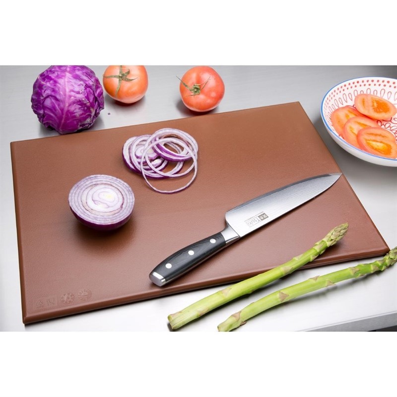Voorkom kruisbesmetting in uw keuken met deze bruine snijplank van Hygiplas. De plank is zeer handig wanneer u gebruik maakt van een kleurensysteem waarbij elke kleur snijplank voor een bepaald type product gebruikt wordt om de verspreiding van schadelijke bacteriën tegen te gaan. Zo is deze snijplank te gebruiken voor bereid vlees. De snijplank is niet-absorberend, reukloos, niet-toxisch en voldoet aan alle hygiënevoorschriften. Ook is de plank zeer robuust en duurzaam en bestand tegen veelvuldig gebruik in een drukke, professionele keuken.