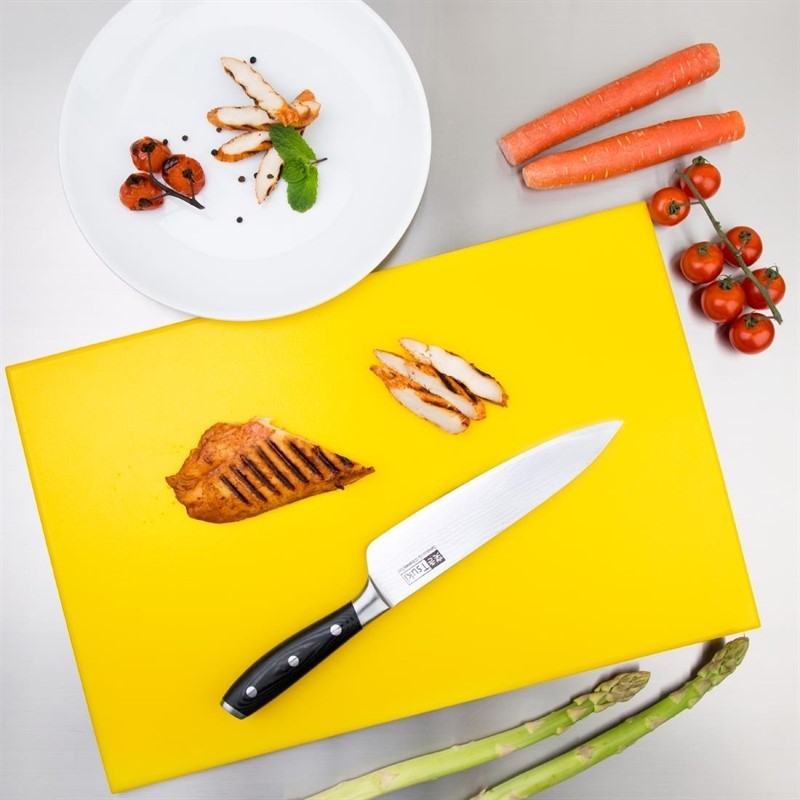 Voorkom kruisbesmetting in uw keuken met deze gele snijplank van Hygiplas. De plank is zeer handig wanneer u gebruik maakt van een kleurensysteem waarbij elke kleur snijplank voor een bepaald type product gebruikt wordt om de verspreiding van schadelijke bacteriën tegen te gaan. Zo is deze snijplank te gebruiken voor gevogelte. De snijplank is niet-absorberend, reukloos, niet-toxisch en voldoet aan alle hygiënevoorschriften. Ook is de plank zeer robuust en duurzaam en bestand tegen veelvuldig gebruik in een drukke, professionele keuken.