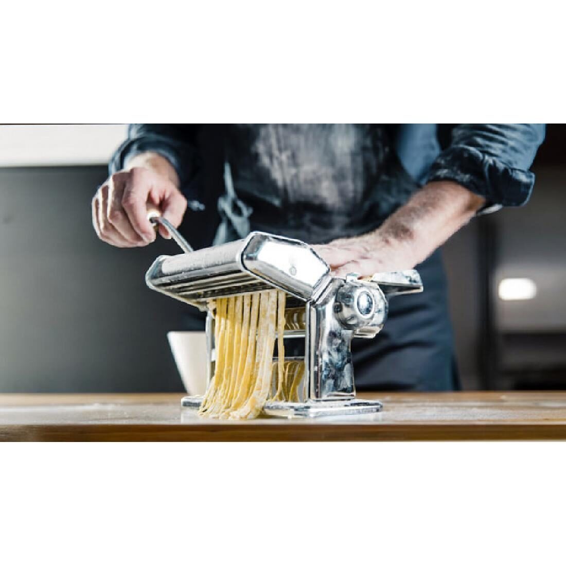 Volledig stalen pastamachine geschikt voor 23cm brede pasta vellen in 10 diktes, met een maximale dikte van 1cm. Messen wordt apart verkocht, verkrijgbaar in 2mm en 6,5mm breedte.