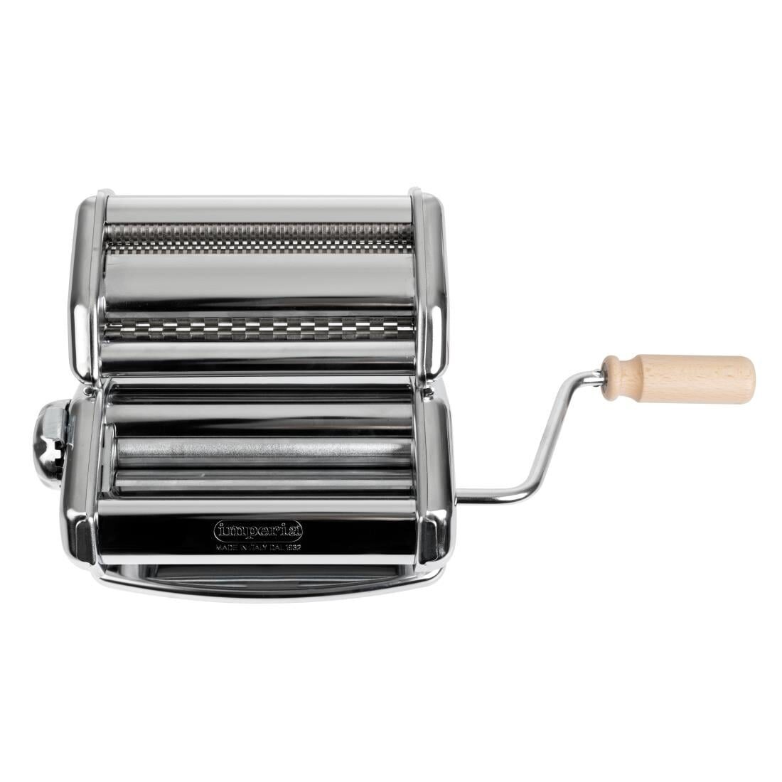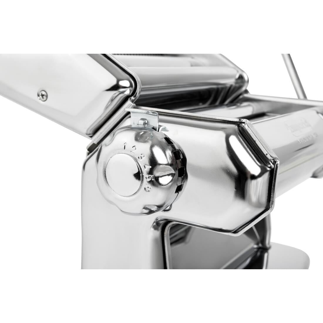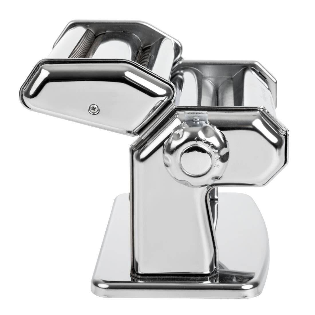 Verchroomde pastamachine voor het maken van 15cm brede pastavellen in 6 verschillende diktes. Geleverd met 'duplex' te koppelen snijder, om tagliatelle en fettuccine te maken. Optionele lade voor ravioli en roller verkrijgbaar.