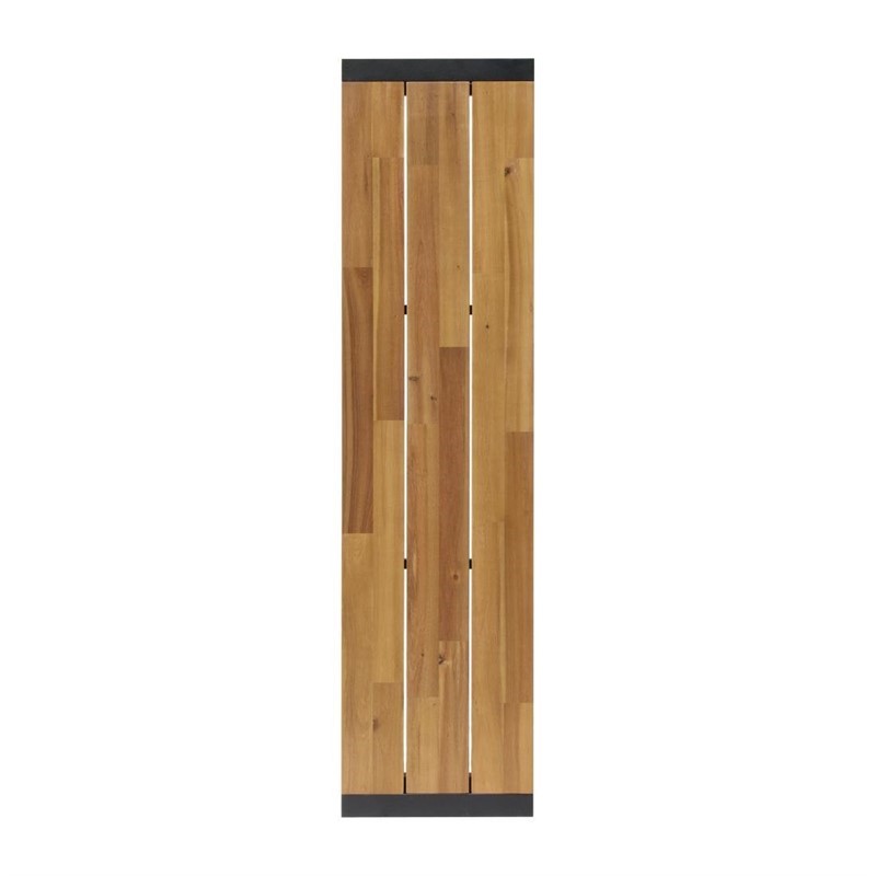 Stalen frame. Houten zitting. 45(h)x160(b)x38(d)cm. 2 stuks.
