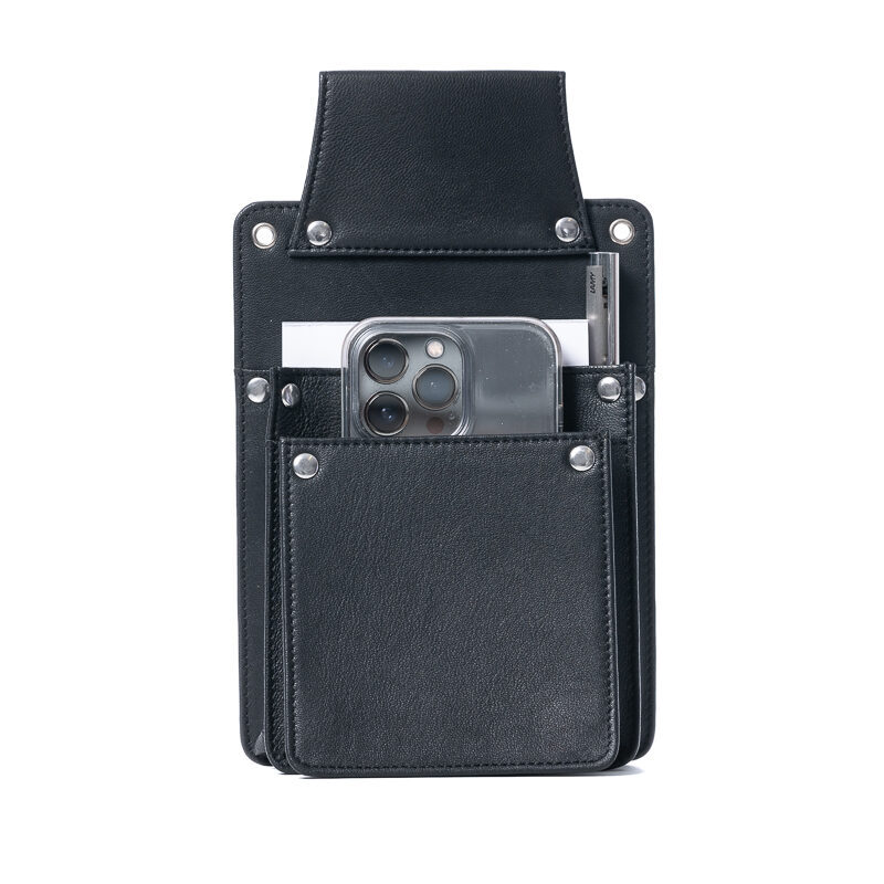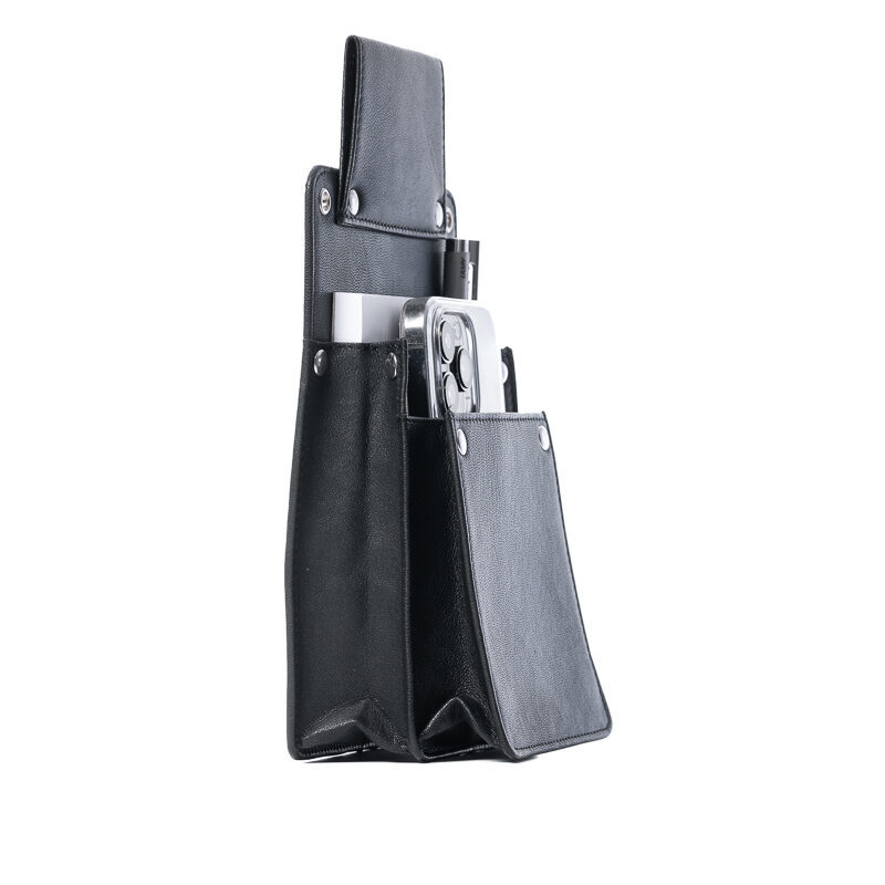 Dit holster is gemaakt van zeer stevig rundleer, de hoeken zijn voorzien van klinknagels voor extra stevigheid. Het holster is voorzien van een groot vak (afm: 11 x 14cm) voor het opbergen van een kelnerbeurs of koopmanbeurs. Aan de voorzijde bevindt zich nog een extra vak voor het dragen van een mobile terminal (afm. 9,5 x 14 cm). Het holster is voorzien van 2 metalen ogen voor het bevestigen van een metalen ketting aan een beurs en terminal. De riemlus kan gebruikt worden voor een riem van max. 4,5 cm.