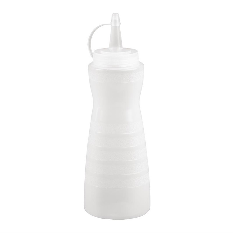 Transparante knijpfles met deksel voor geleidelijke en constante hoeveelheid saus en olie. Heeft een inhoud van 34cl. Ideaal voor drukke, professionele keukens, afhaalrestaurants en buitenverkopers.