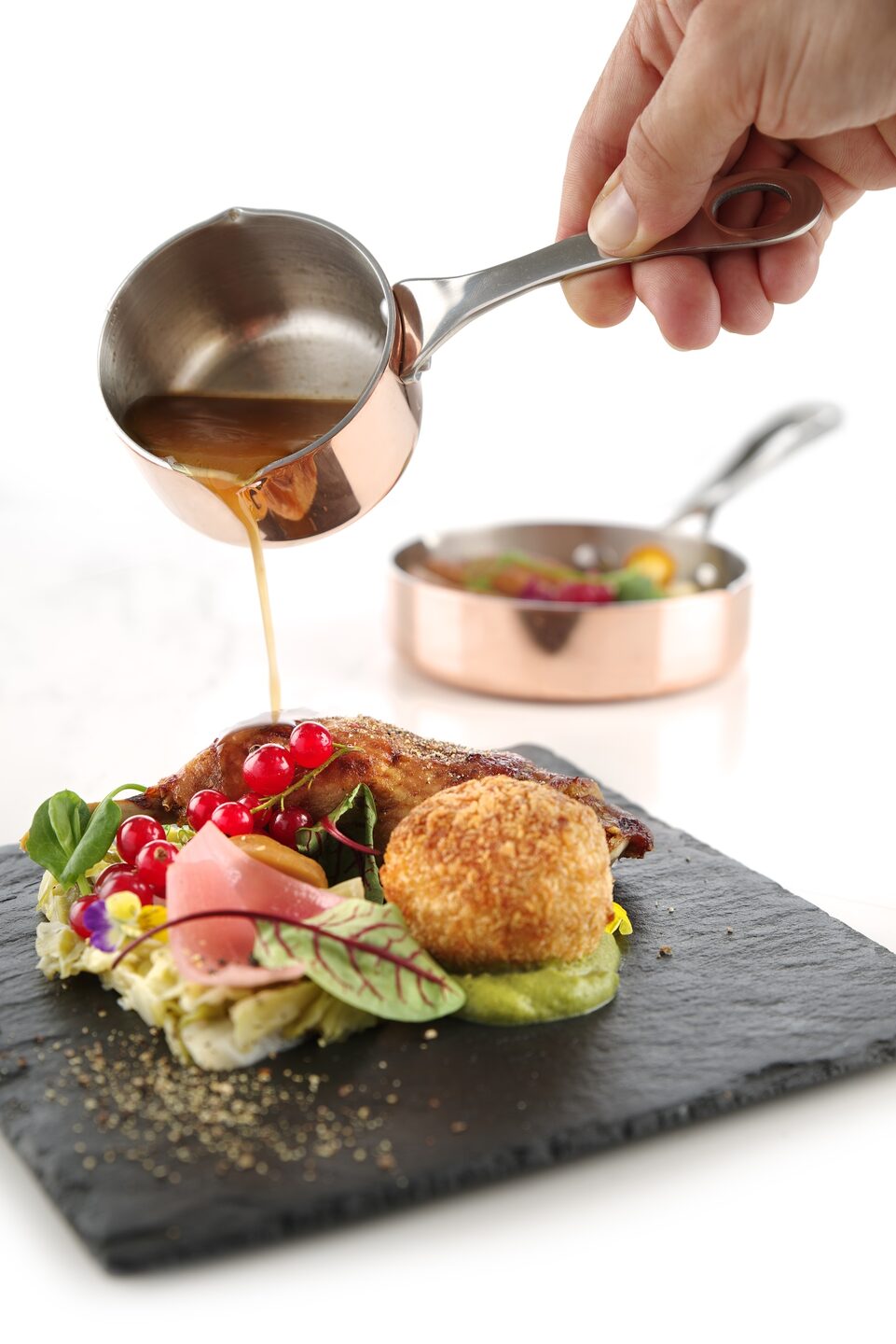 Gemaakt van 2,5 mm dik 3-ply materiaal, koper/aluminium/roestvast staal. Handgreep bevestigd met klinknagels. Aluminium. Nieuw. Niet geschikt voor vaatwasmachines. Roestvast staal.