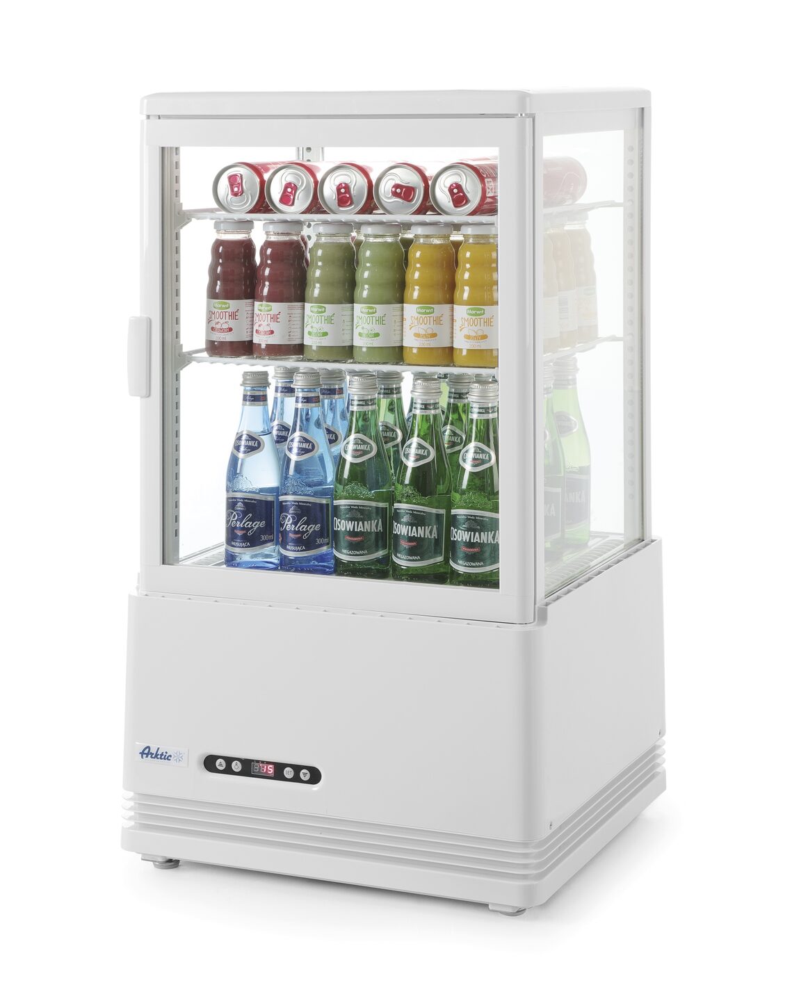 Behuizing van gecoat roestvast staal met dubbele beglazing. Met zelfsluitende deur. Geforceerde luchtkoeling met automatische ontdooiing, compressor geplaatst onder de koelruimte. Luchtkanaal buiten het glas blaast lucht over het glas om condens te verwijderen en te voorkomen. Duurzame planken met PVC-coating, in hoogte verstelbaar. Met heldere LED-verlichting in het plafond. Digitale temperatuurregelaar en display. Temperatuurbereik: 2/6° C. Klimaatklasse: 4. Koelmiddel: R600A. Met 2 schappen en in hoogte verstelbare poten. Roestvast staal.