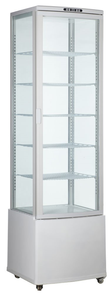 Behuizing van gecoat roestvast staal met dubbele beglazing. Met zelfsluitende deur. Geforceerde luchtkoeling met automatische ontdooiing, compressor geplaatst onder de koelruimte. Luchtkanaal buiten het glas blaast lucht over het glas om condens te verwijderen en te voorkomen. Duurzame planken met PVC-coating, in hoogte verstelbaar. Met heldere LED-verlichting in het plafond. Digitale temperatuurregelaar en display. Temperatuurbereik: 2/6° C. Klimaatklasse: 4. Koelmiddel: R600A. Met 5 schappen en op wielen, waarvan 2 met rem. Nieuw. Roestvast staal.