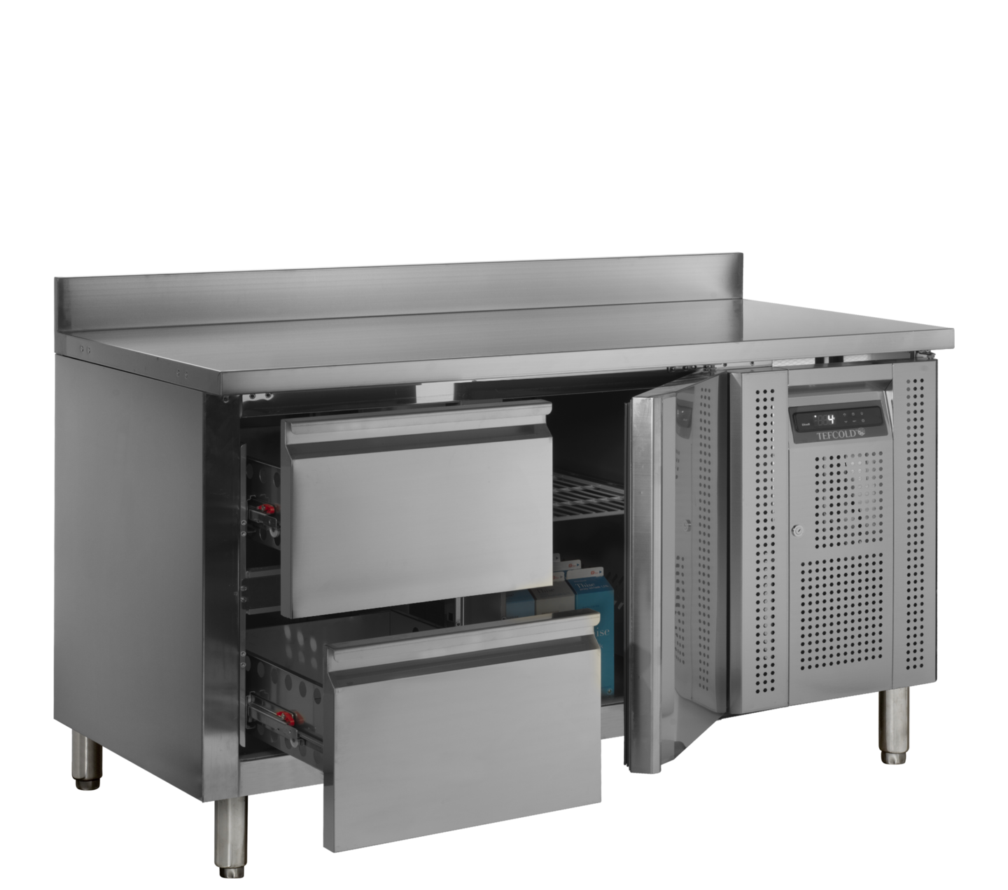 Koelwerkbank in roestrvij staal met GN1/1-lades en roosters.