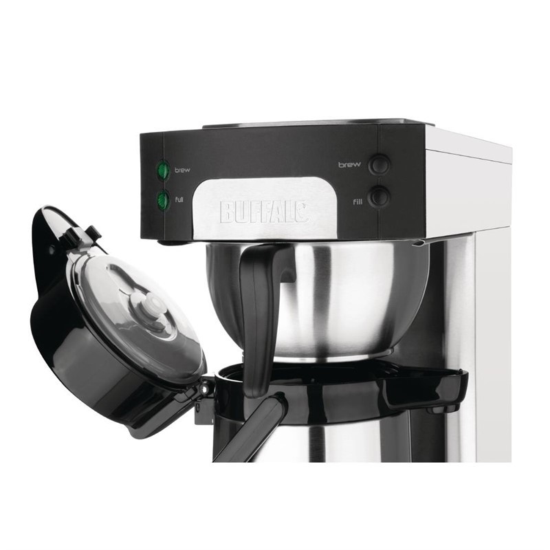 Verhoog de efficiëntie in uw horecazaak met dit professionele Buffalo koffiezetapparaat. Dankzij de snelle zetcapaciteit van 2 liter in minder dan 6 minuten en de uitstekende isolatie van de meegeleverde RVS thermoskannen, serveert u altijd verse, hete koffie aan uw gasten. Dit stijlvolle en compacte apparaat is de perfecte partner voor zowel front-of-house presentaties als intensief gebruik in de keuken.