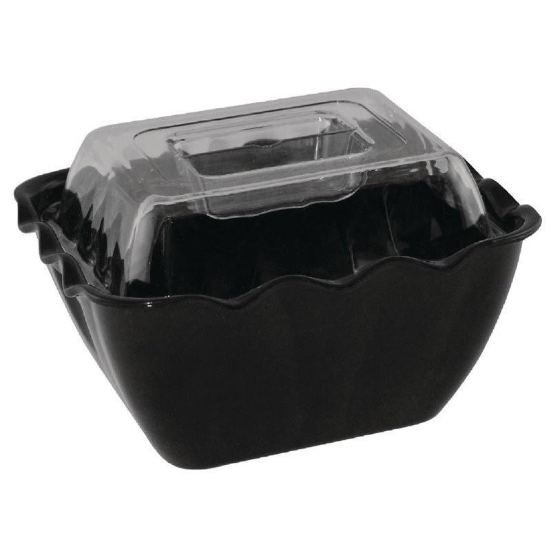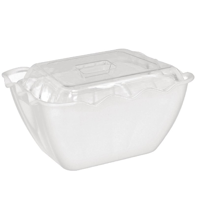 Transparant, kunststof deksel voor de 0,75 liter buffetschalen van Kristallon. Deze hoge deksel kan ook gebruikt worden als buffetverhoger.