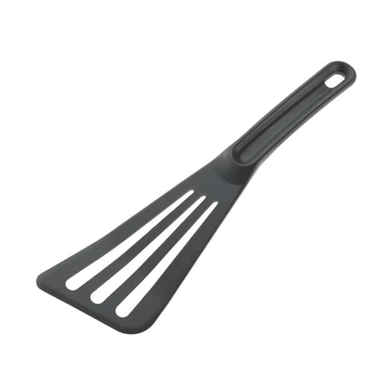 Deze hittebestendige spatel van Matfer is een onmisbaar stuk keukengerei voor iedere professionele keuken of thuiskeuken. Met de platte spatel kunt u producten met veel precisie optillen en omdraaien en dankzij de openingen in de spatel vloeit olie, vet en ander vocht netjes weg. Aan het gat in het handvat kunt u hem ophangen zodat hij altijd binnen handbereik is. Omdat de spatel gemaakt is van kunststof kan hij gerust in pannen met een anti-aanbaklaag gebruikt worden, want hij krast niet. Ook is hij bestand tegen temperaturen tot 220°C.