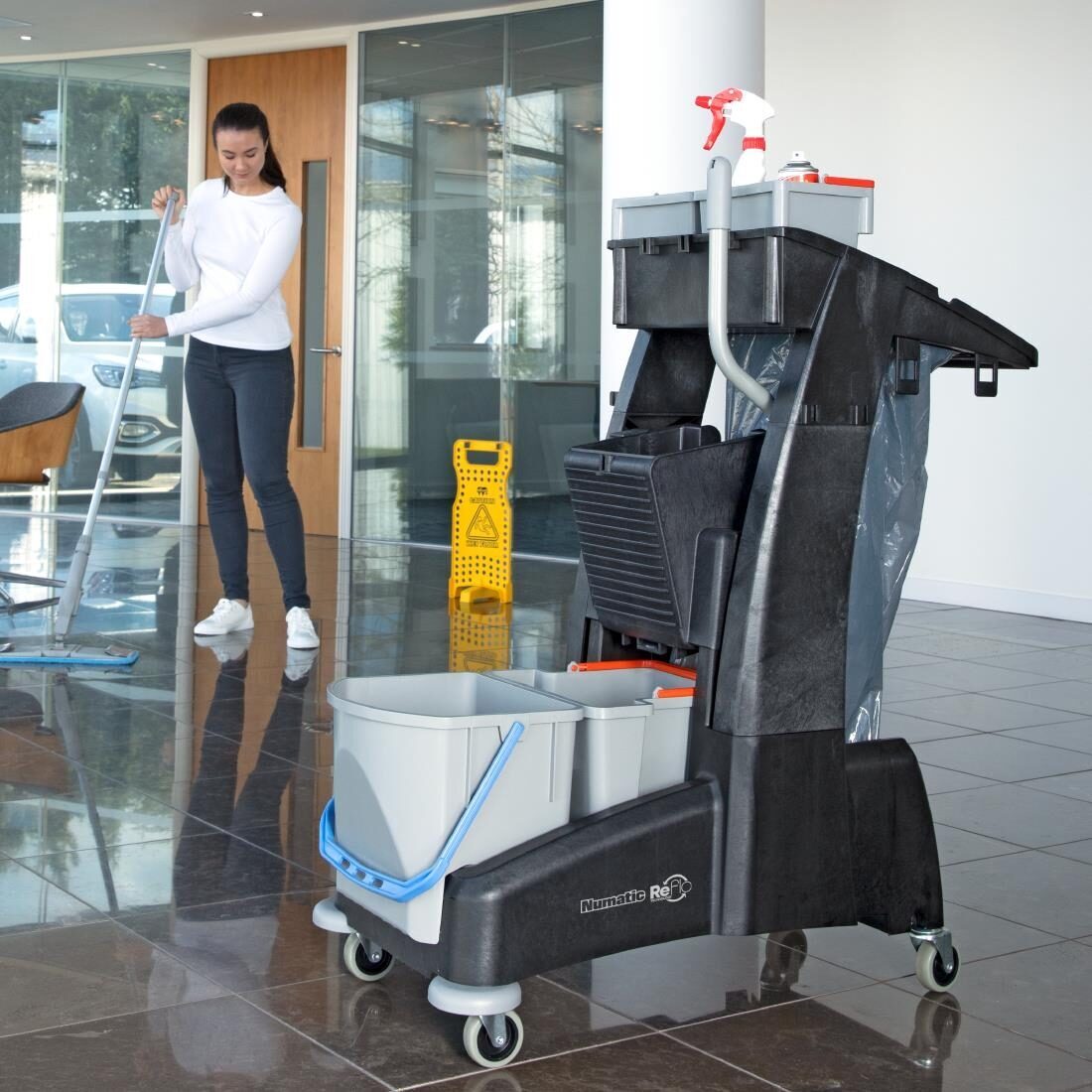 De Numatic compacte MULTI-Matic schoonmaakwagen is gemaakt van hoogwaardig gerecycled plastic met behulp van de duurzame ReFLO-technologie. Bovendien heeft de kar een unieke, zware Structofoam-constructie met copolymeerkwaliteitsmaterialen, waardoor hij uiterst duurzaam is, bestand tegen chemicaliën en gemakkelijk schoon te maken. Deze compacte trolley bevat twee emmers en een verticale mop-pers voor een compact mop-systeem. Het heeft ook handige opbergvakken en twee 5-liter emmers, waardoor alle schoonmaakbenodigdheden gemakkelijk toegankelijk zijn. De trolleys zijn zeer geschikt voor kantoren en onderwijsinstellingen.