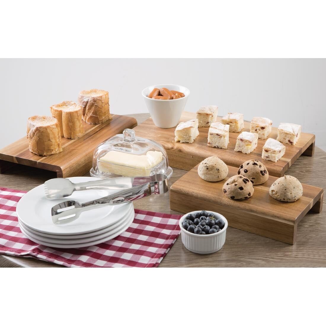 Acaciahouten verhogingsdisplays in verschillende maten voor een aanlokkelijke presentatie van bijvoorbeeld buffetschotels en sharing platters.