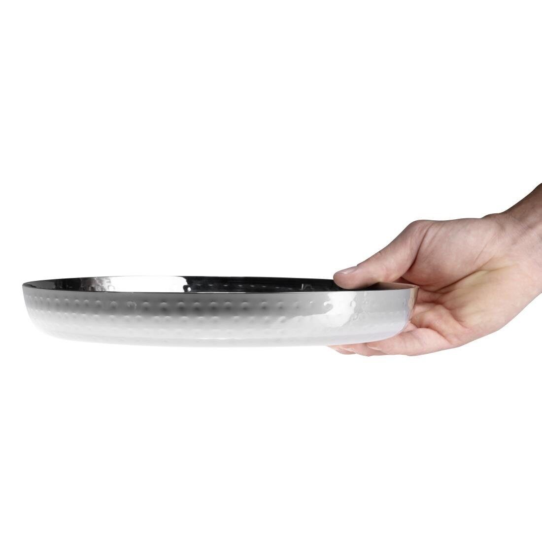 Verhoog uw voedselpresentatie met dit gehamerde roestvrijstalen dienblad van Olympia. De stijlvolle spiegelafwerking en opstaande rand maken het zowel aantrekkelijk als praktisch. Het lichtgewicht ontwerp zorgt voor gemakkelijke hantering door bedienend personeel, terwijl de vaatwasmachinebestendige constructie het schoonmaken en onderhoud vereenvoudigt. Perfect voor het serveren van hapjes, desserts en drankjes, biedt dit dienblad een duurzame en elegante oplossing voor uw behoeften in de foodservice.